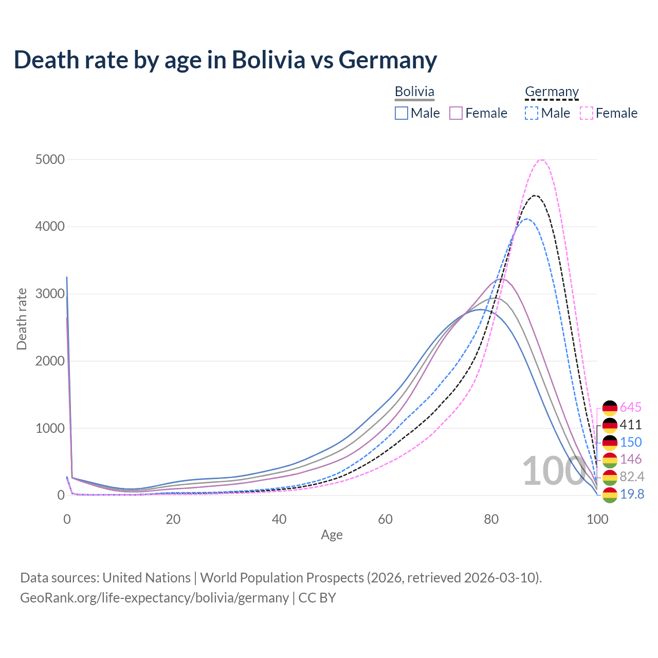 In Bolivia, the most common age of death is 0, compared to 88 in Germany. The median age of death is 74.5 in Bolivia and 85.1 in Germany, meaning only half of each cohort is expected to live past that age.
