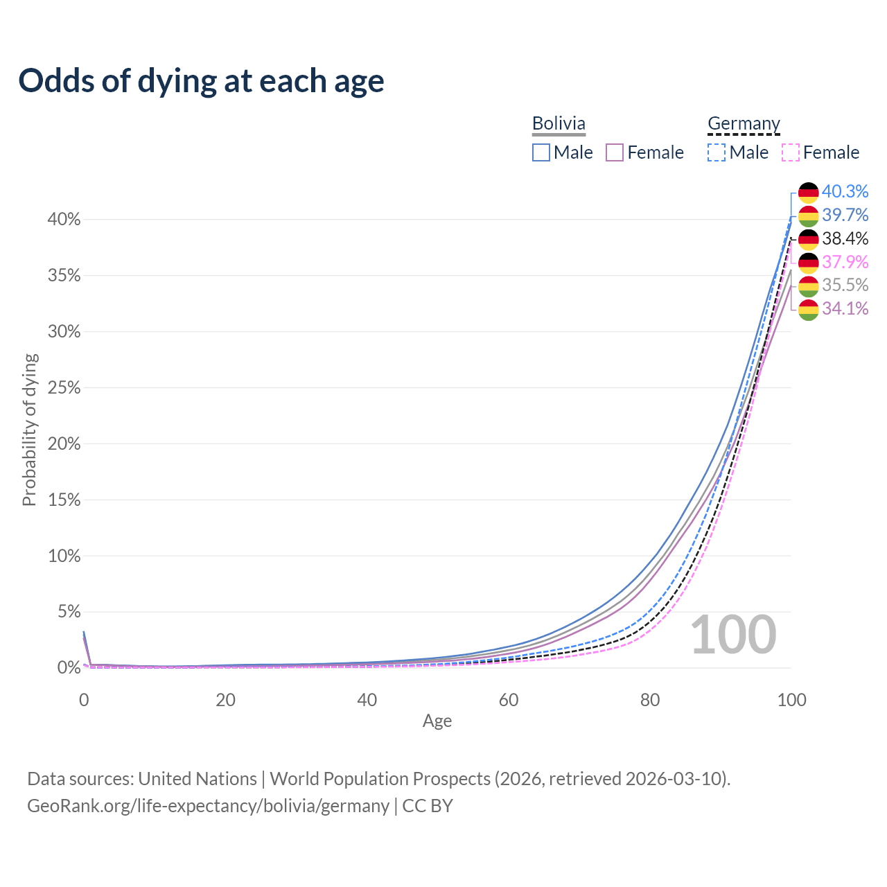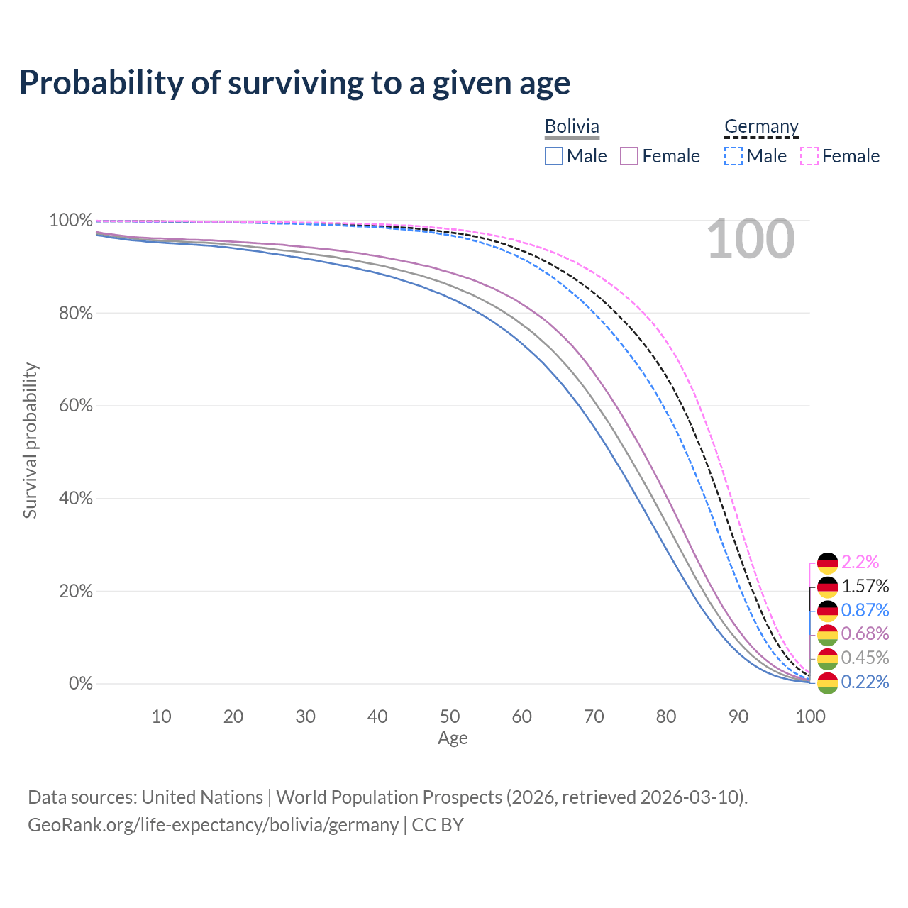 This life expectancy calculator shows the odds of living to 100, 95, 90, and below based on current age for both males and females in Bolivia and Germany, along with mean and median age of death. The calculations are based on the 2026 life tables (actuarial tables) from the UN World Population Prospects.