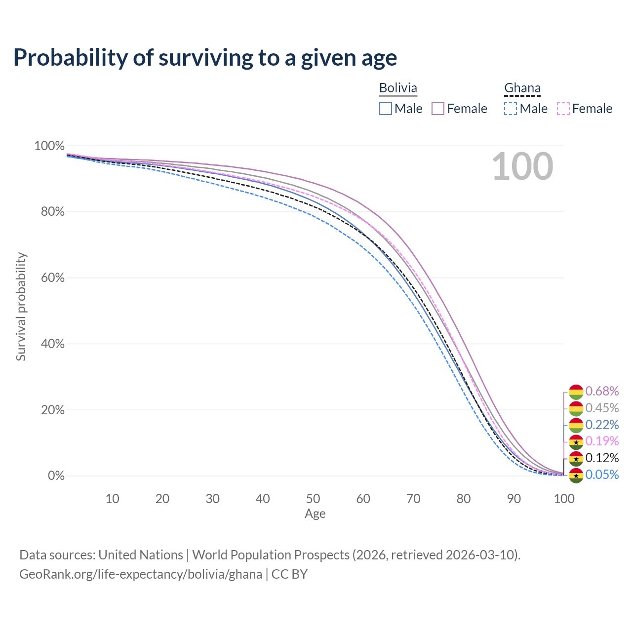 This life expectancy calculator shows the odds of living to 100, 95, 90, and below based on current age for both males and females in Bolivia and Ghana, along with mean and median age of death. The calculations are based on the 2026 life tables (actuarial tables) from the UN World Population Prospects.