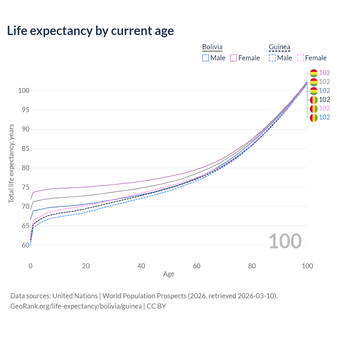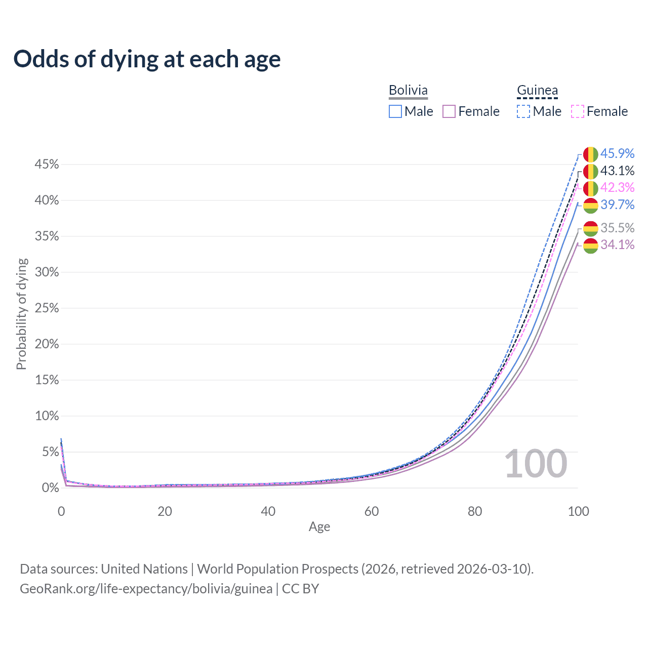 This life expectancy calculator shows the odds of living to 100, 95, 90, and below based on current age for both males and females in Bolivia and Guinea, along with mean and median age of death. The calculations are based on the 2026 life tables (actuarial tables) from the UN World Population Prospects.