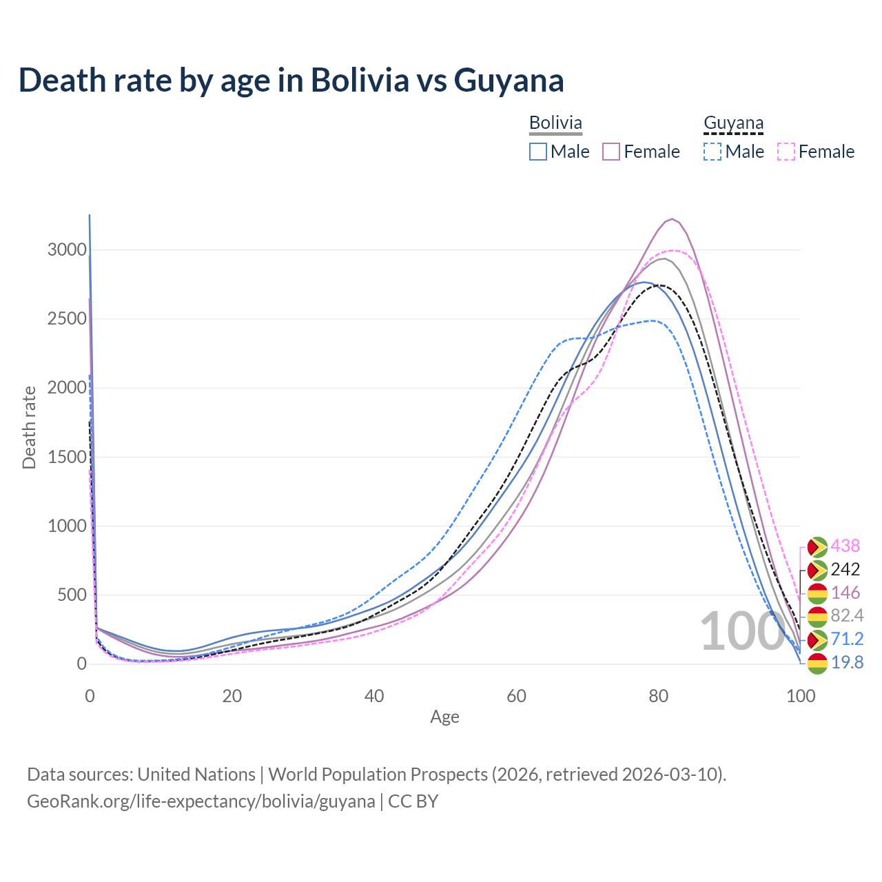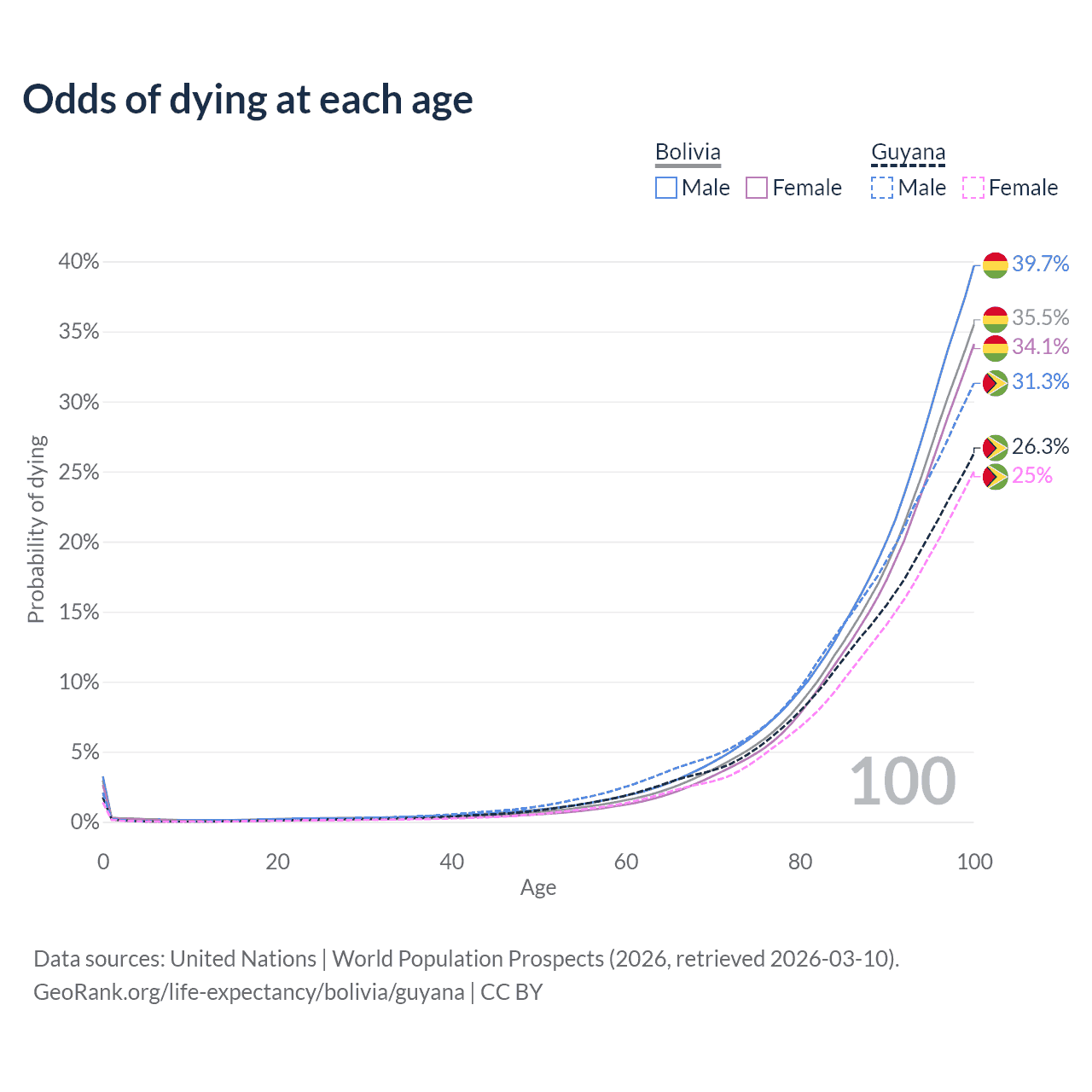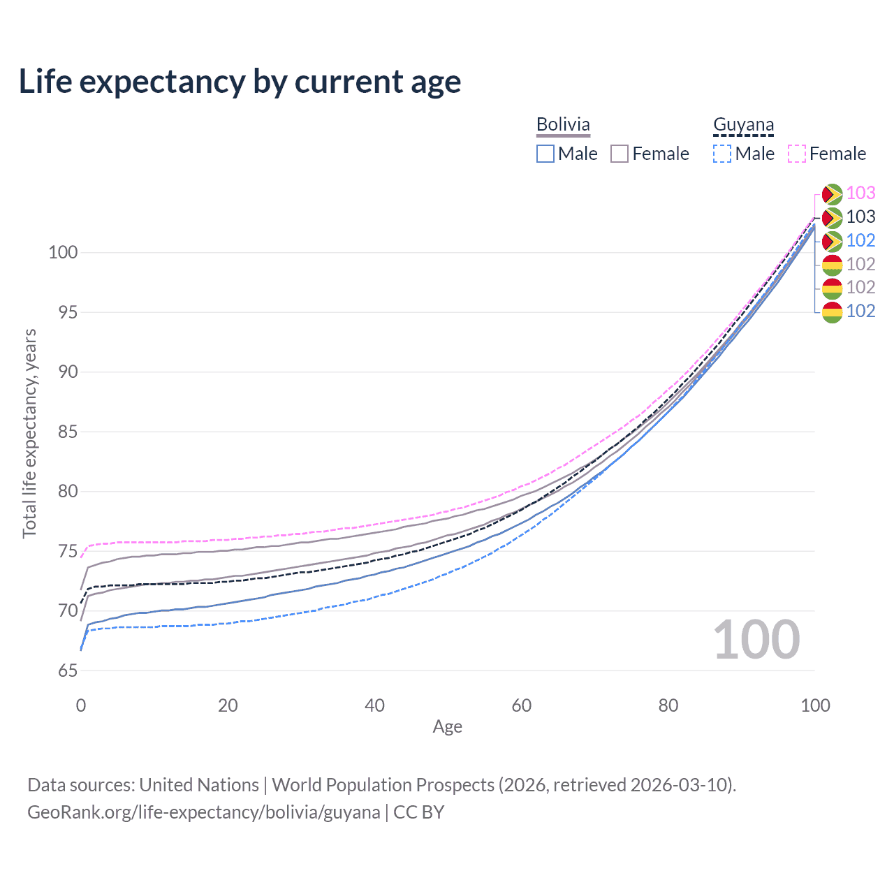 This life expectancy calculator shows the odds of living to 100, 95, 90, and below based on current age for both males and females in Bolivia and Guyana, along with mean and median age of death. The calculations are based on the 2026 life tables (actuarial tables) from the UN World Population Prospects.