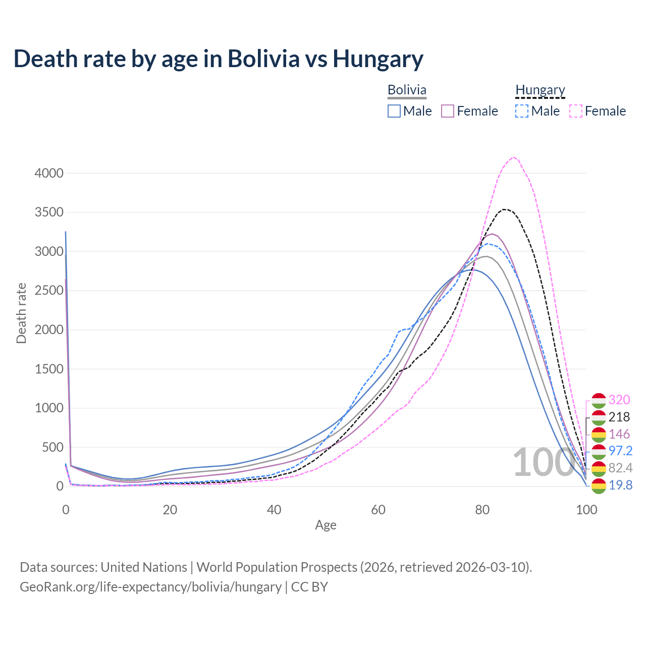 In Bolivia, the most common age of death is 0, compared to 84 in Hungary. The median age of death is 74.5 in Bolivia and 80.4 in Hungary, meaning only half of each cohort is expected to live past that age.