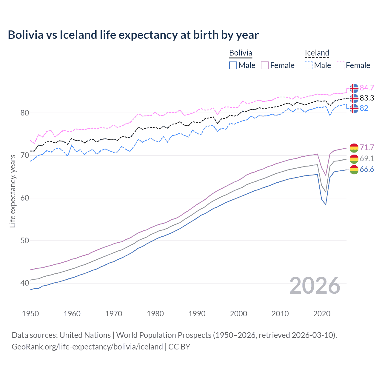 The average life expectancy at birth is 69.1 years in Bolivia vs 83.3 in Iceland. Bolivia is ranked 145/197 by life expectancy, and Iceland is 18/197. In Bolivia, the life expectancy is 66.6 years for males and 71.7 years for females. In Iceland, it's 82 years for males and 84.7 years for females.