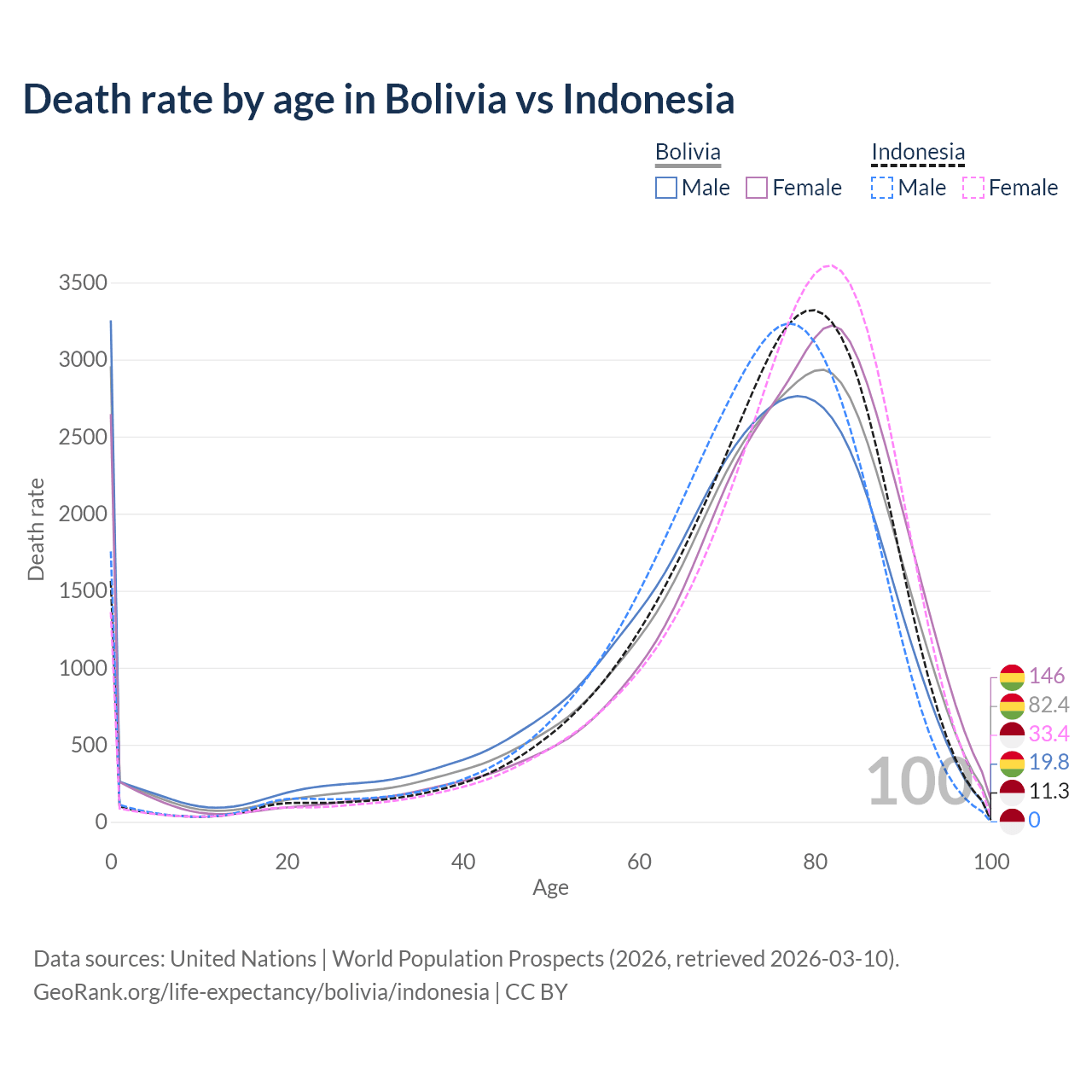 In Bolivia, the most common age of death is 0, compared to 80 in Indonesia. The median age of death is 74.5 in Bolivia and 75.6 in Indonesia, meaning only half of each cohort is expected to live past that age.
