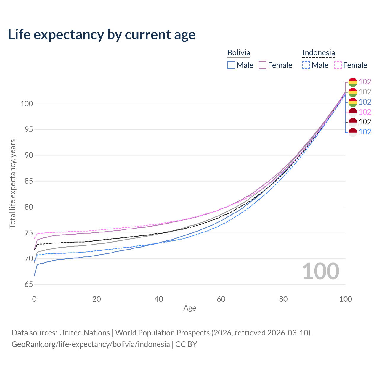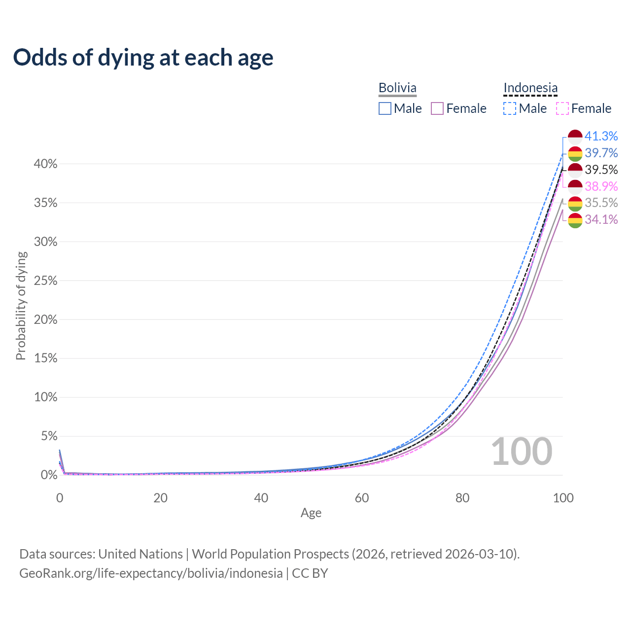 This life expectancy calculator shows the odds of living to 100, 95, 90, and below based on current age for both males and females in Bolivia and Indonesia, along with mean and median age of death. The calculations are based on the 2026 life tables (actuarial tables) from the UN World Population Prospects.