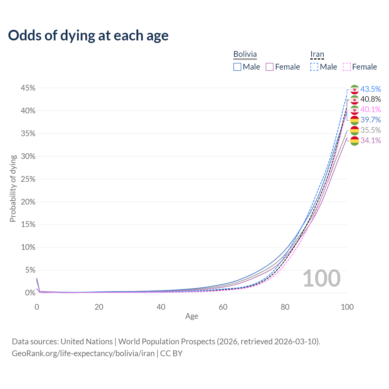 This life expectancy calculator shows the odds of living to 100, 95, 90, and below based on current age for both males and females in Bolivia and Iran, along with mean and median age of death. The calculations are based on the 2026 life tables (actuarial tables) from the UN World Population Prospects.