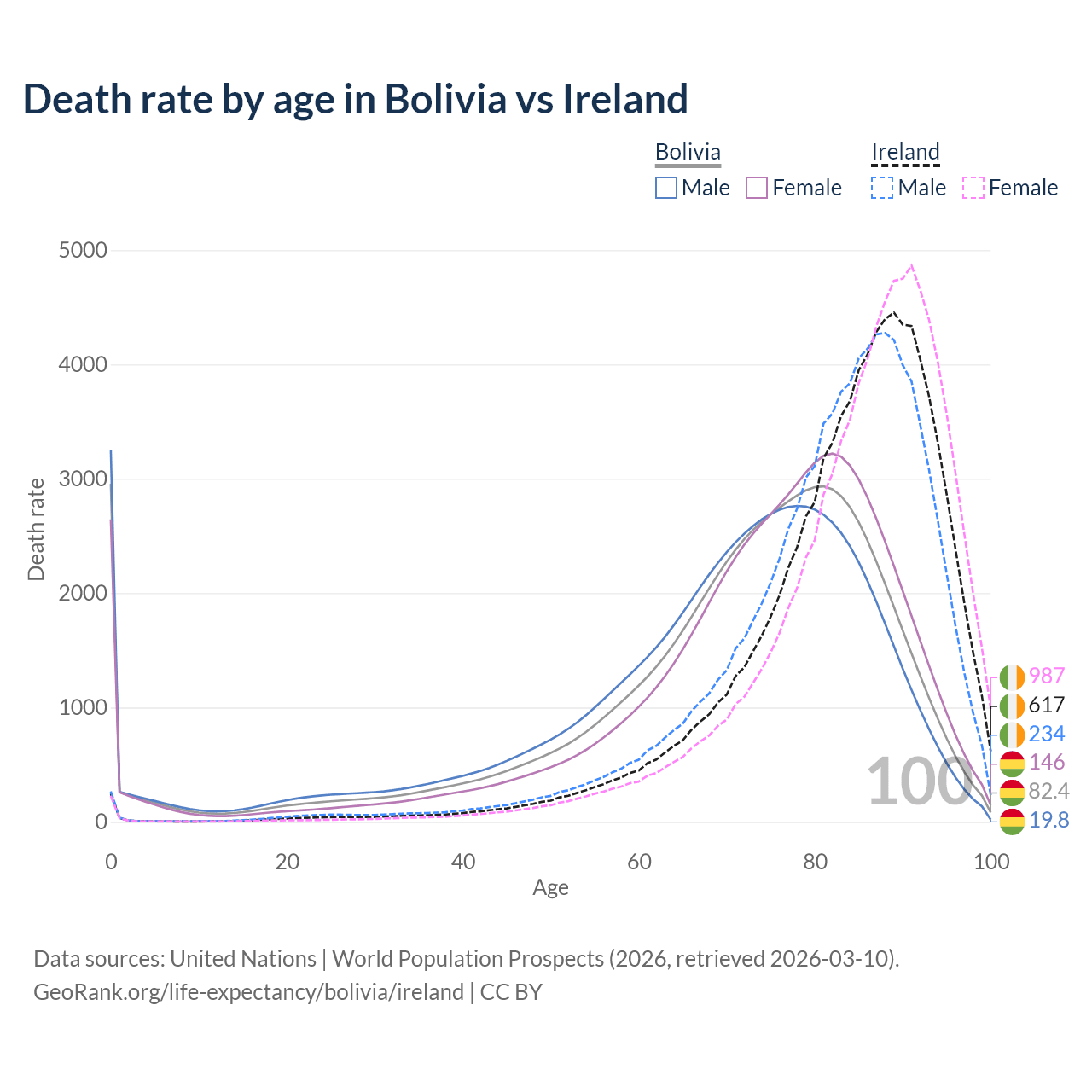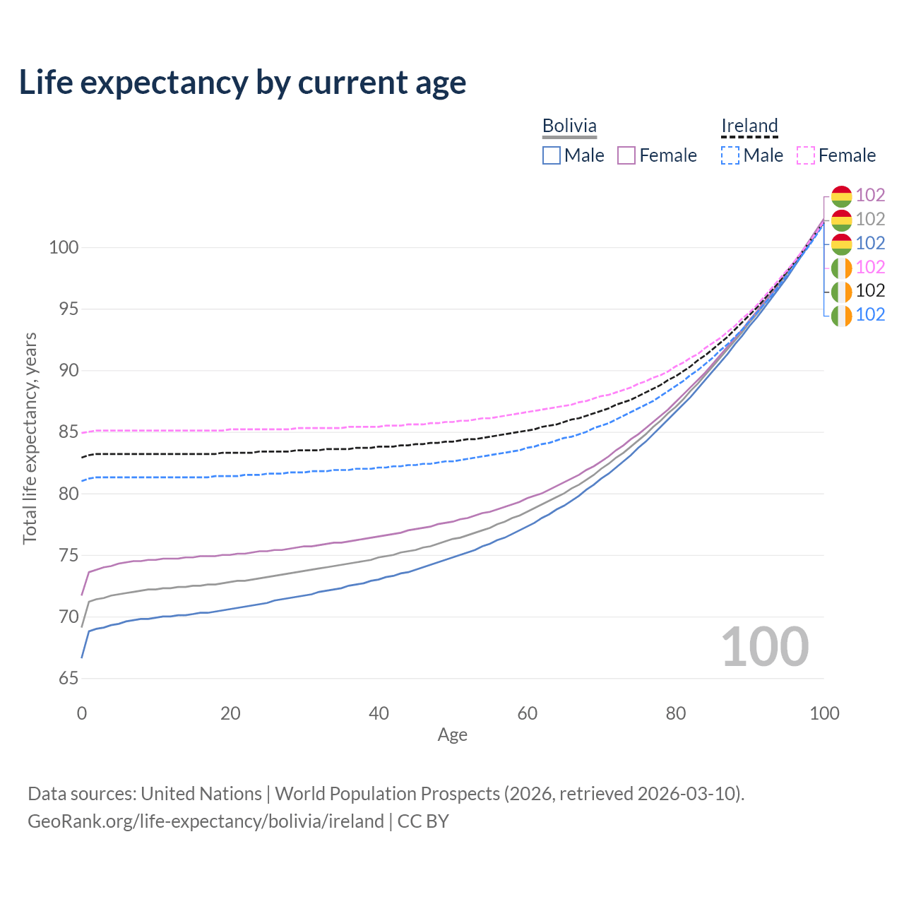 This life expectancy calculator shows the odds of living to 100, 95, 90, and below based on current age for both males and females in Bolivia and Ireland, along with mean and median age of death. The calculations are based on the 2026 life tables (actuarial tables) from the UN World Population Prospects.