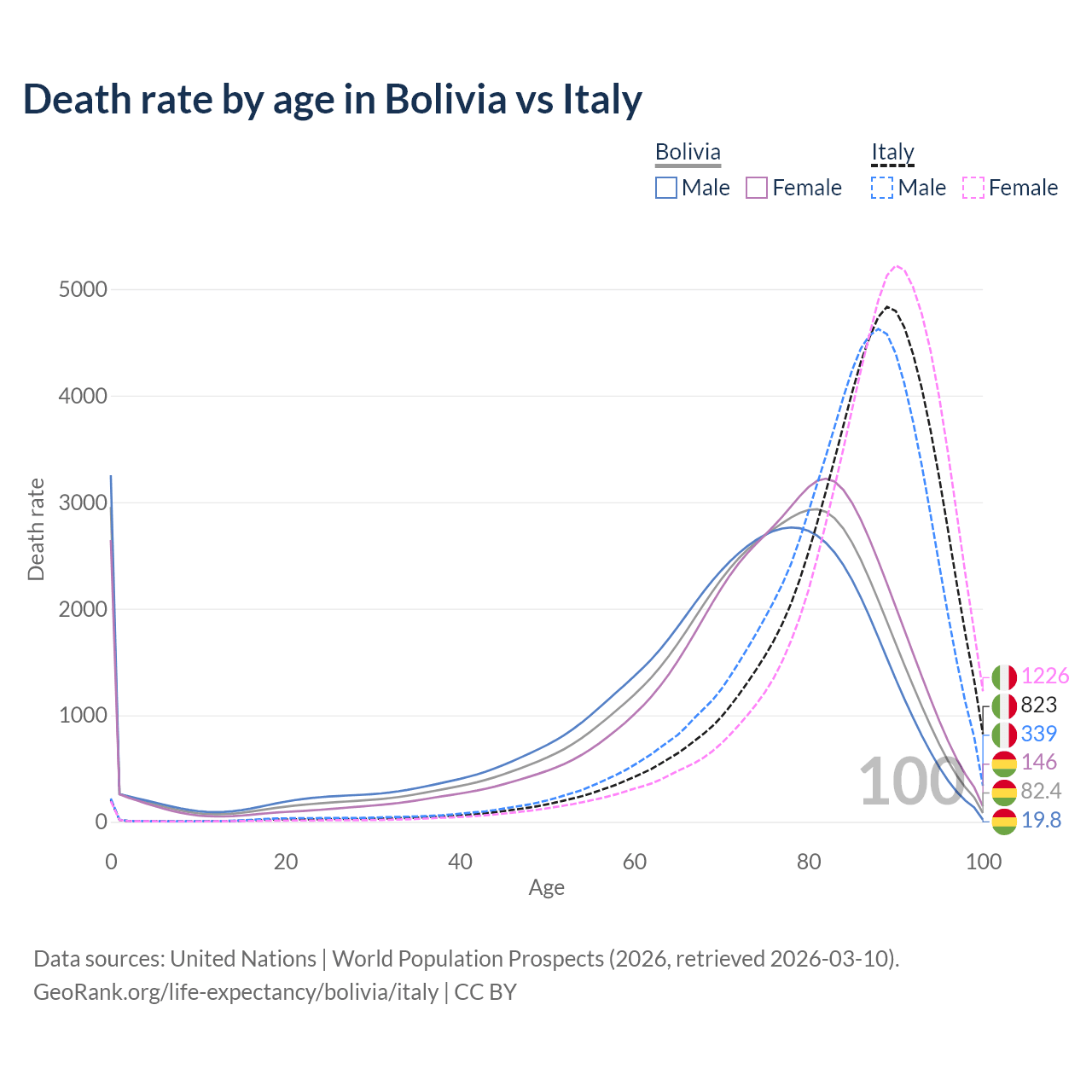 In Bolivia, the most common age of death is 0, compared to 89 in Italy. The median age of death is 74.5 in Bolivia and 86.9 in Italy, meaning only half of each cohort is expected to live past that age.