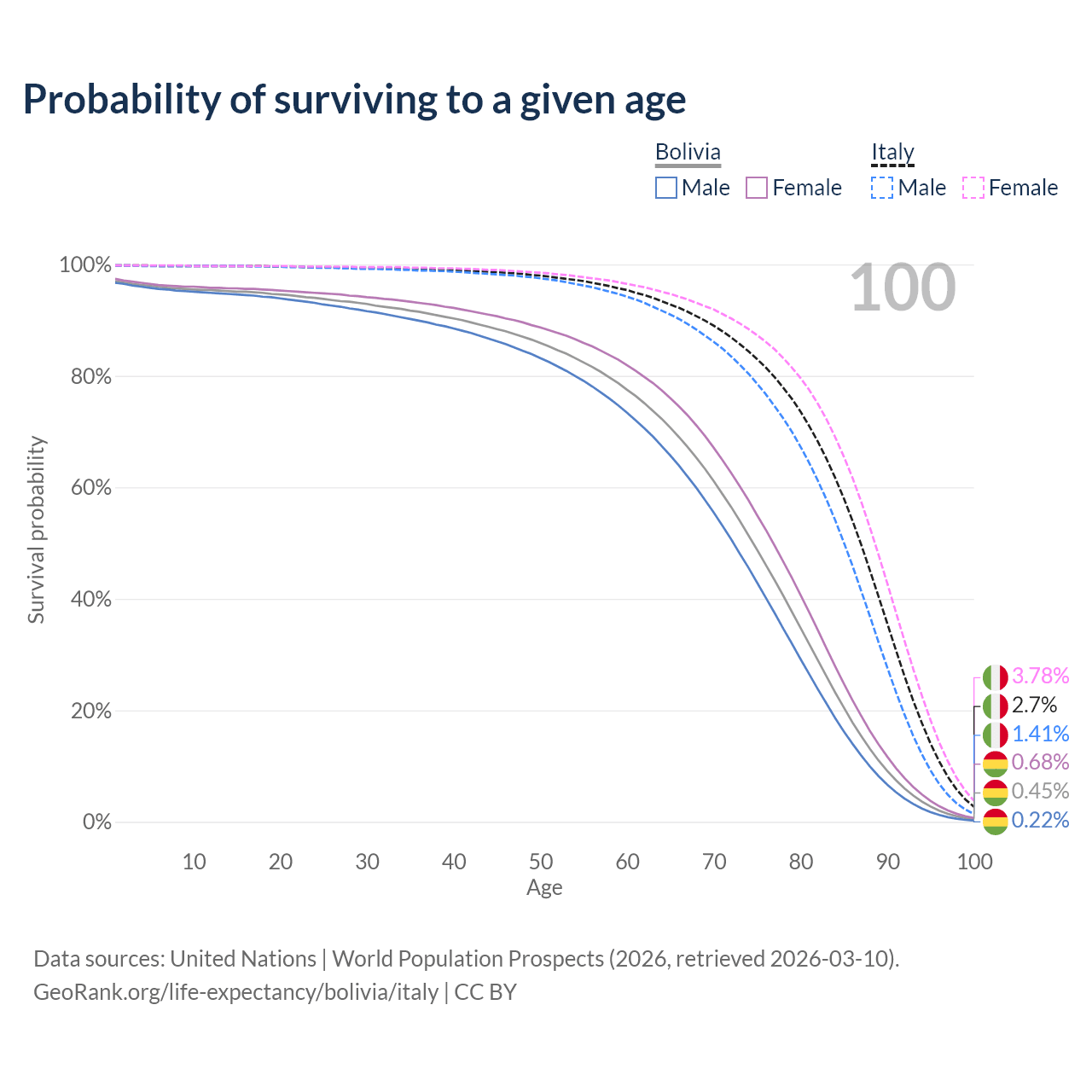This life expectancy calculator shows the odds of living to 100, 95, 90, and below based on current age for both males and females in Bolivia and Italy, along with mean and median age of death. The calculations are based on the 2026 life tables (actuarial tables) from the UN World Population Prospects.