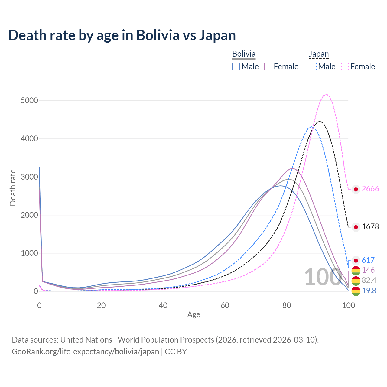 In Bolivia, the most common age of death is 0, compared to 91 in Japan. The median age of death is 74.5 in Bolivia and 88.1 in Japan, meaning only half of each cohort is expected to live past that age.