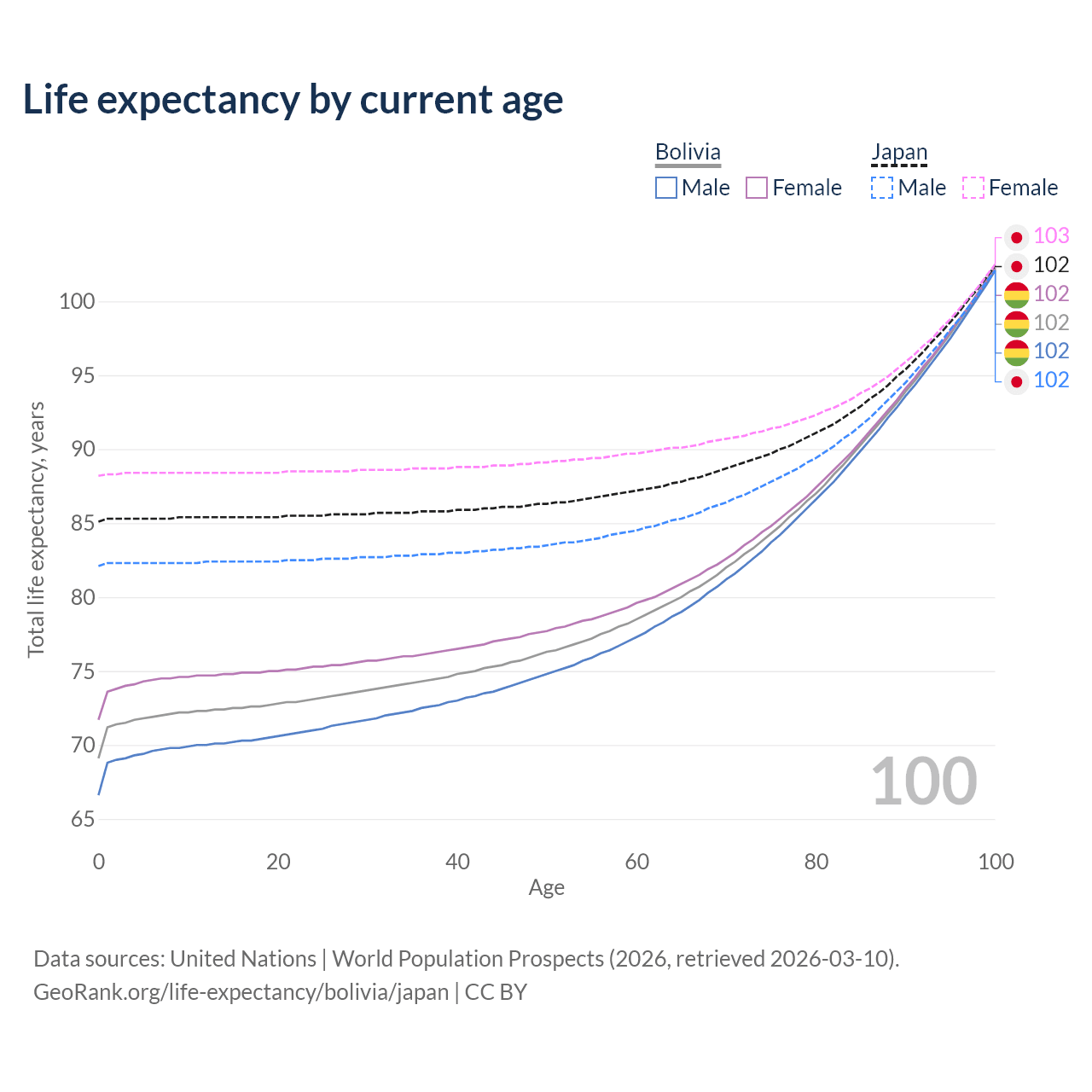 This life expectancy calculator shows the odds of living to 100, 95, 90, and below based on current age for both males and females in Bolivia and Japan, along with mean and median age of death. The calculations are based on the 2026 life tables (actuarial tables) from the UN World Population Prospects.
