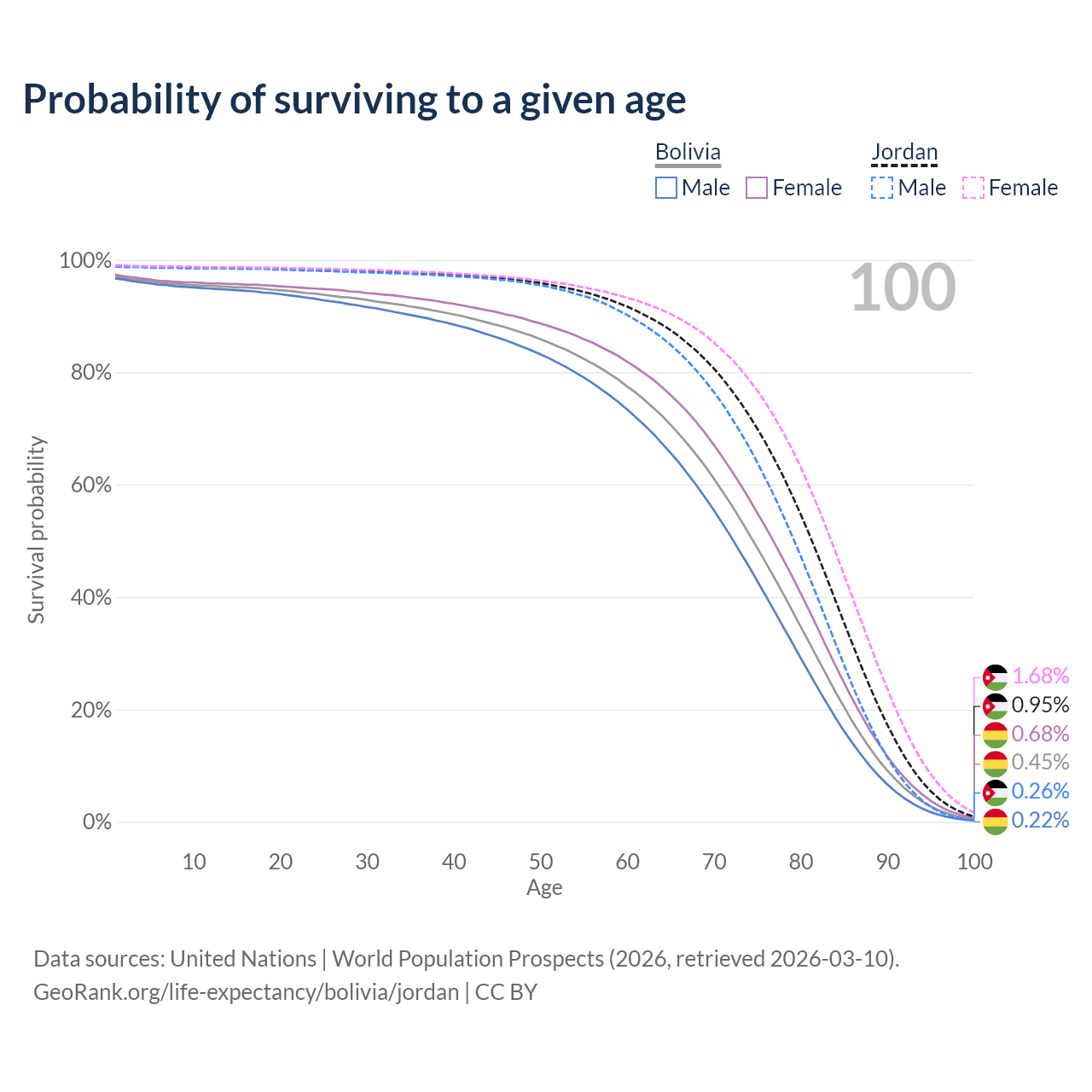 This life expectancy calculator shows the odds of living to 100, 95, 90, and below based on current age for both males and females in Bolivia and Jordan, along with mean and median age of death. The calculations are based on the 2026 life tables (actuarial tables) from the UN World Population Prospects.
