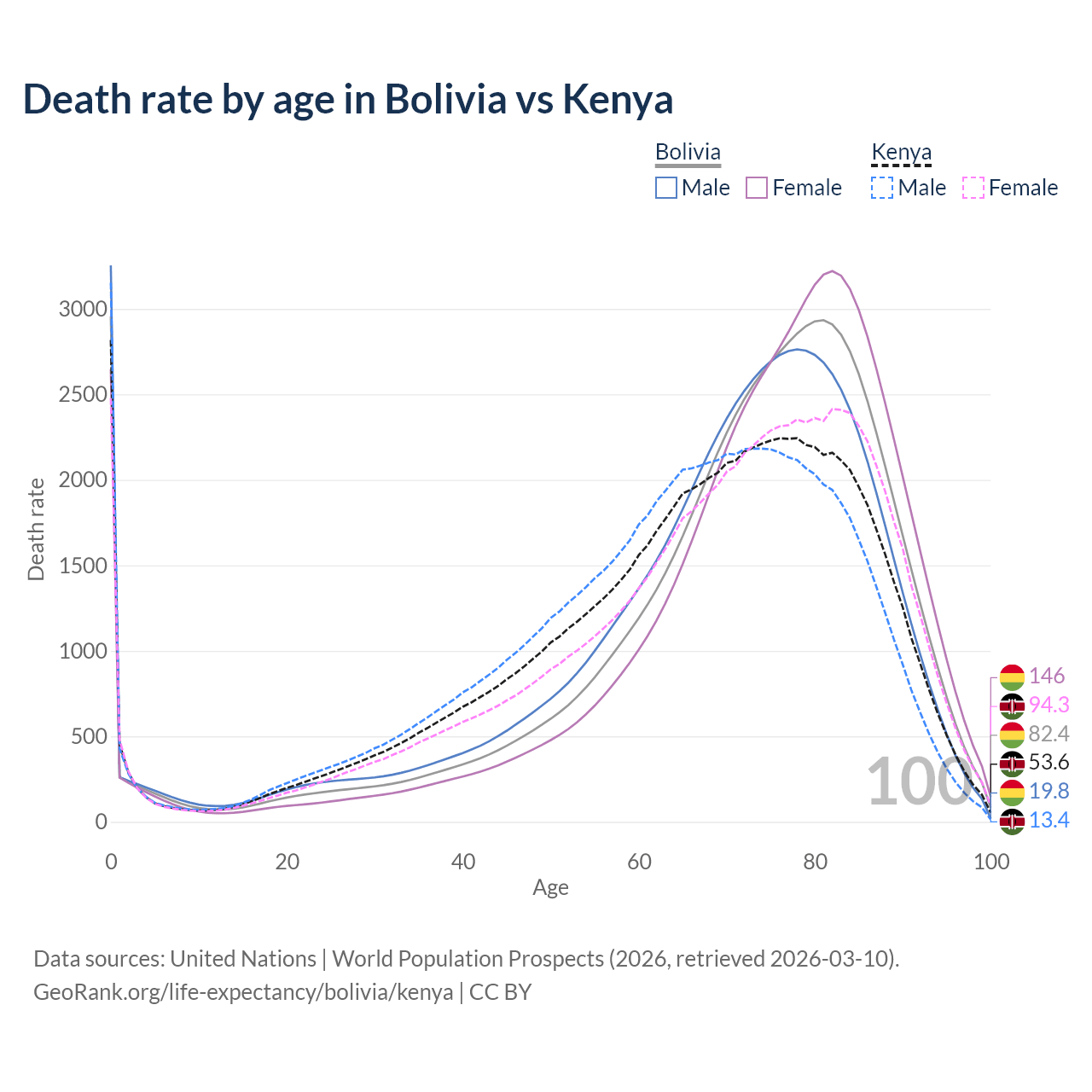 This life expectancy calculator shows the odds of living to 100, 95, 90, and below based on current age for both males and females in Bolivia and Kenya, along with mean and median age of death. The calculations are based on the 2026 life tables (actuarial tables) from the UN World Population Prospects.