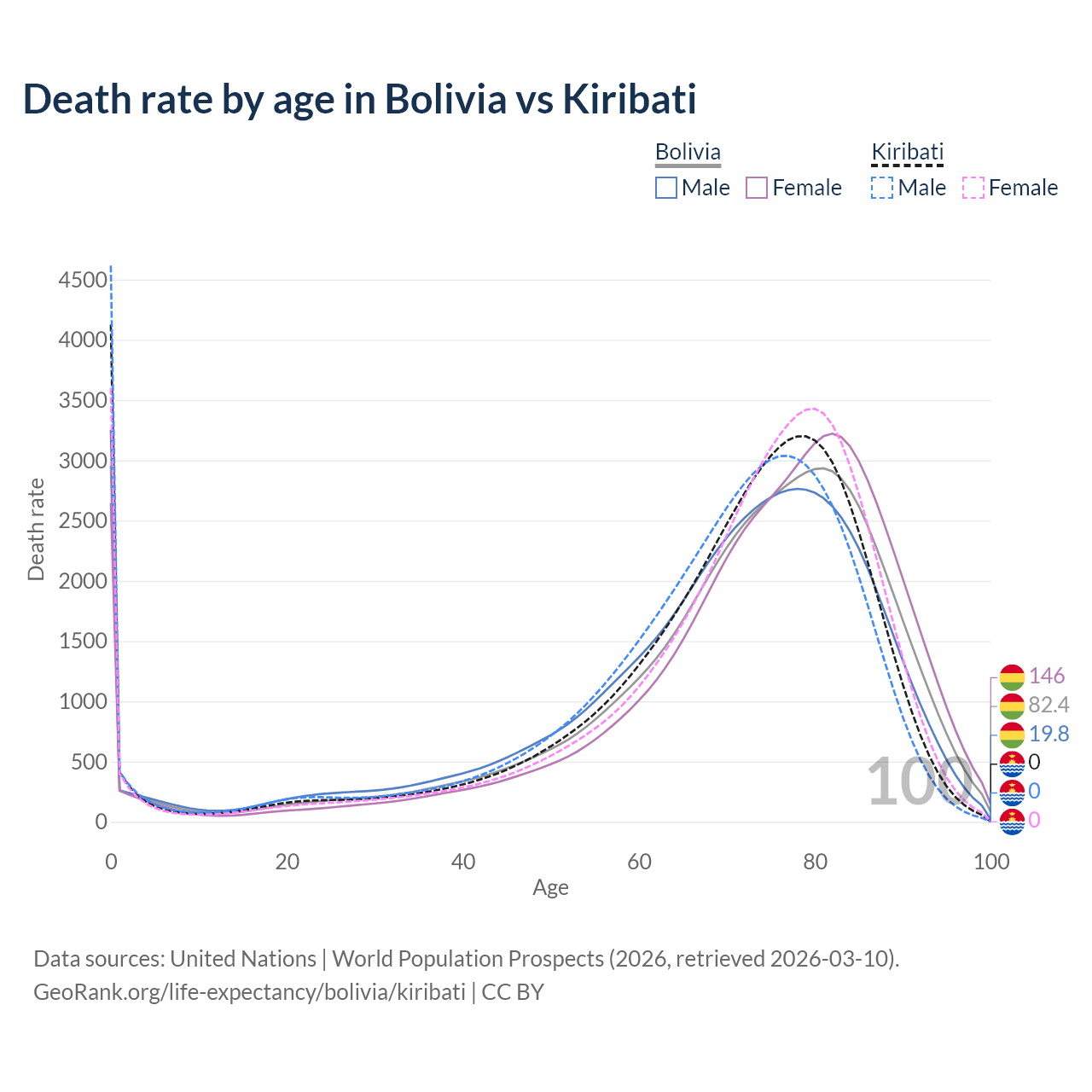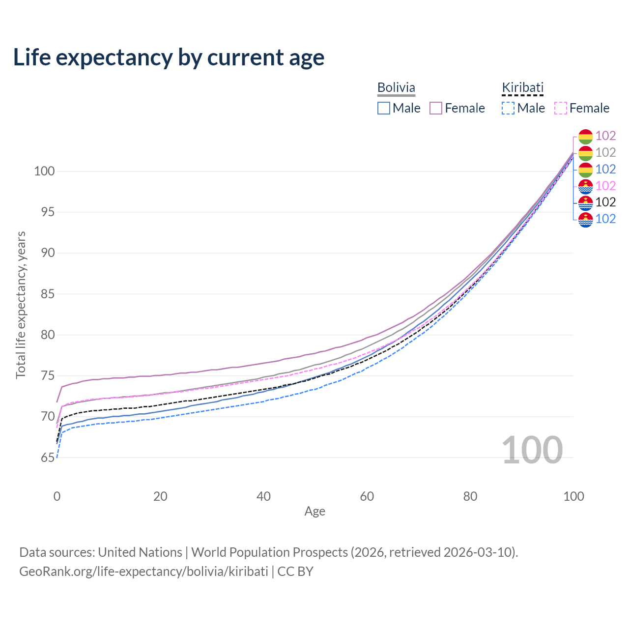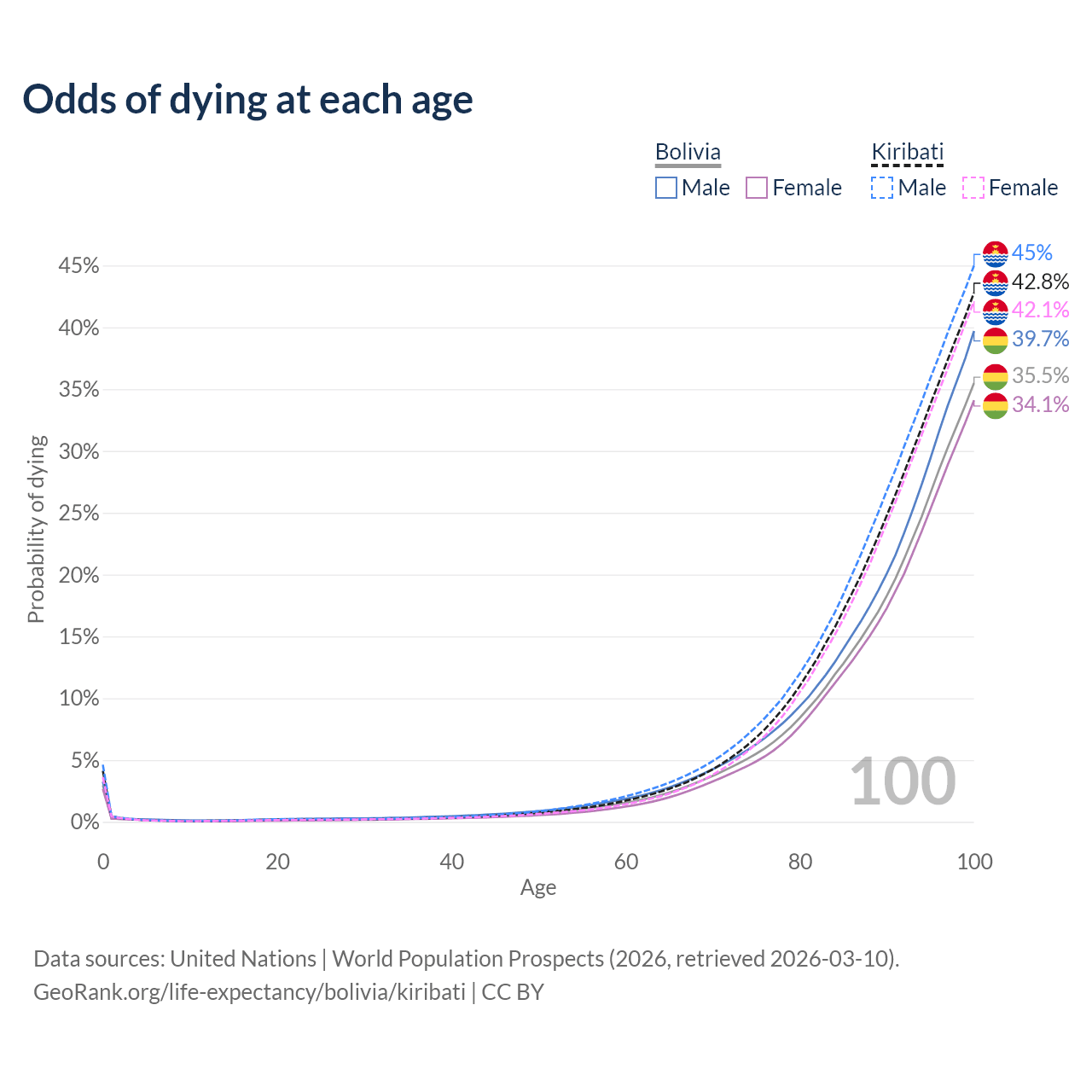 This life expectancy calculator shows the odds of living to 100, 95, 90, and below based on current age for both males and females in Bolivia and Kiribati, along with mean and median age of death. The calculations are based on the 2026 life tables (actuarial tables) from the UN World Population Prospects.
