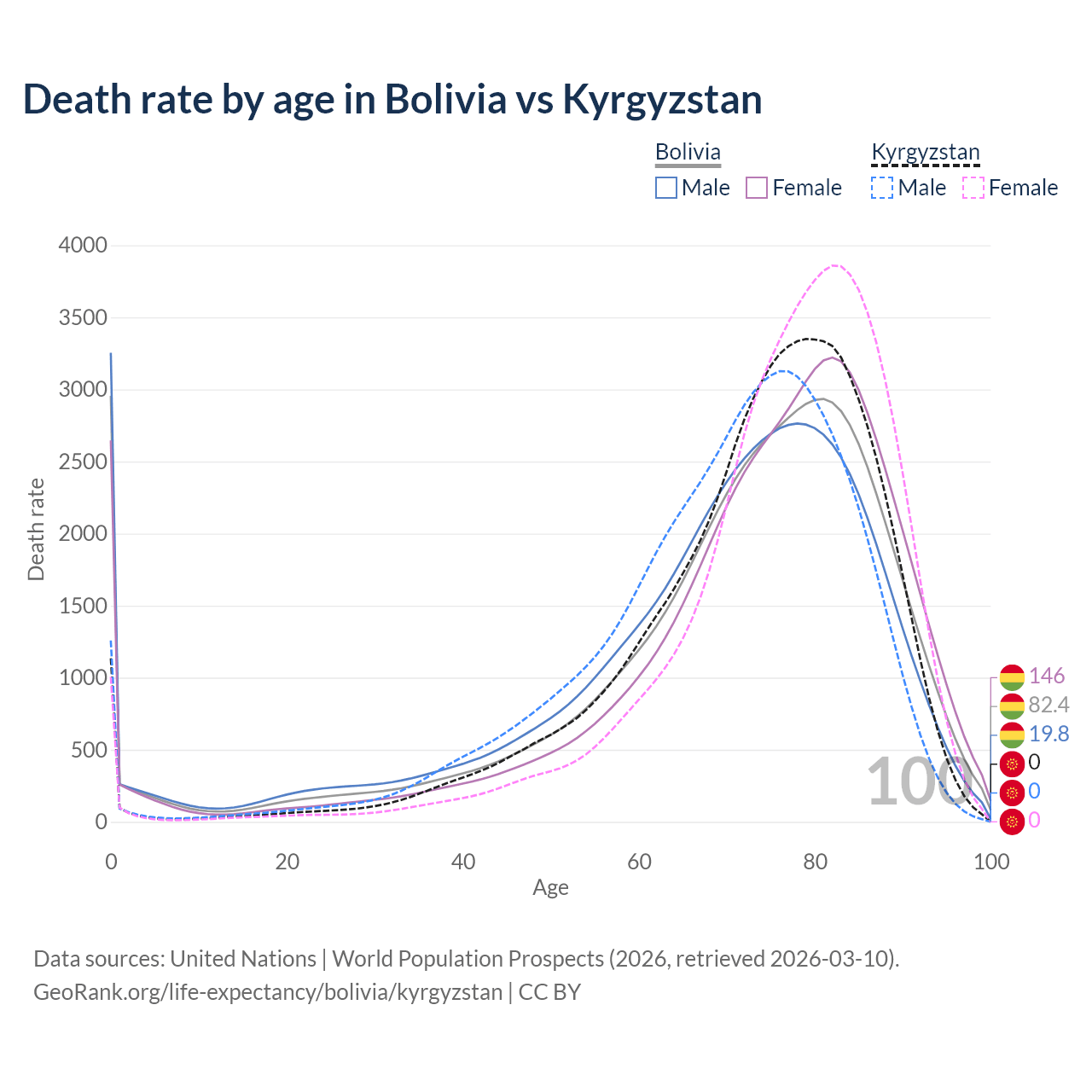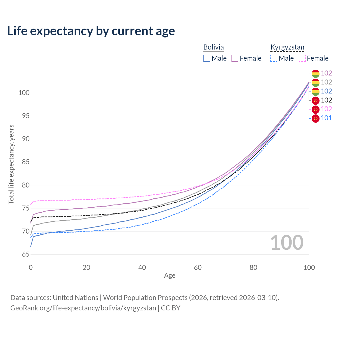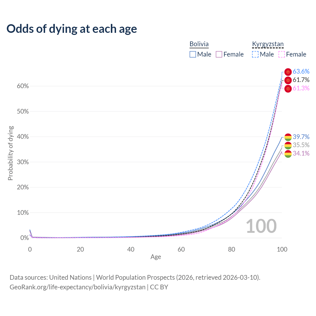 This life expectancy calculator shows the odds of living to 100, 95, 90, and below based on current age for both males and females in Bolivia and Kyrgyzstan, along with mean and median age of death. The calculations are based on the 2026 life tables (actuarial tables) from the UN World Population Prospects.