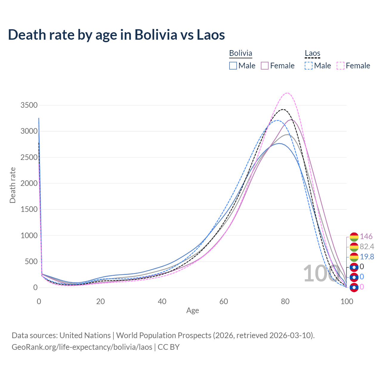 In Bolivia, the most common age of death is 0, compared to 79 in Laos. The median age of death is 74.5 in Bolivia and 74.7 in Laos, meaning only half of each cohort is expected to live past that age.
