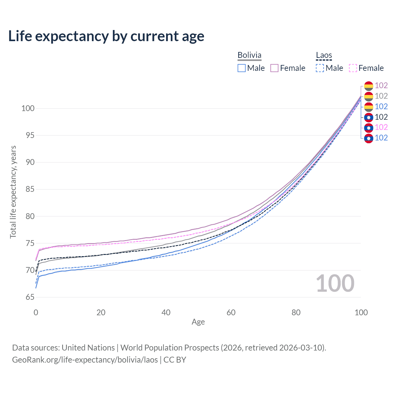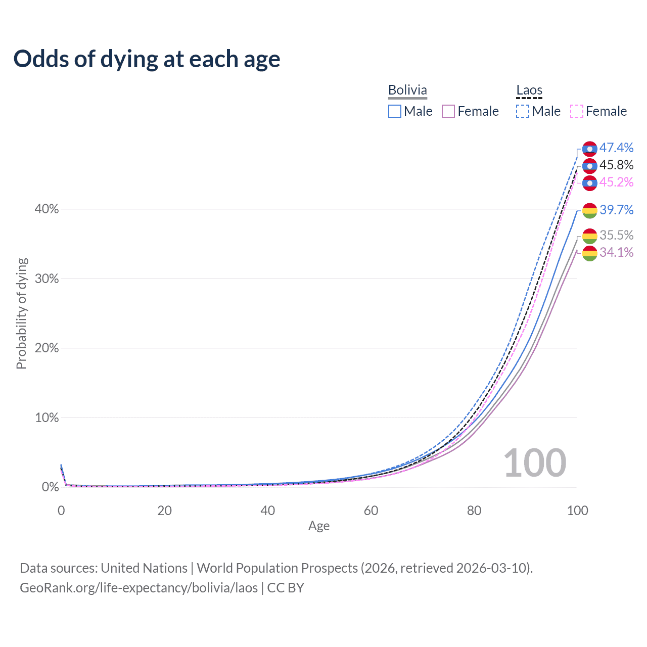 This life expectancy calculator shows the odds of living to 100, 95, 90, and below based on current age for both males and females in Bolivia and Laos, along with mean and median age of death. The calculations are based on the 2026 life tables (actuarial tables) from the UN World Population Prospects.