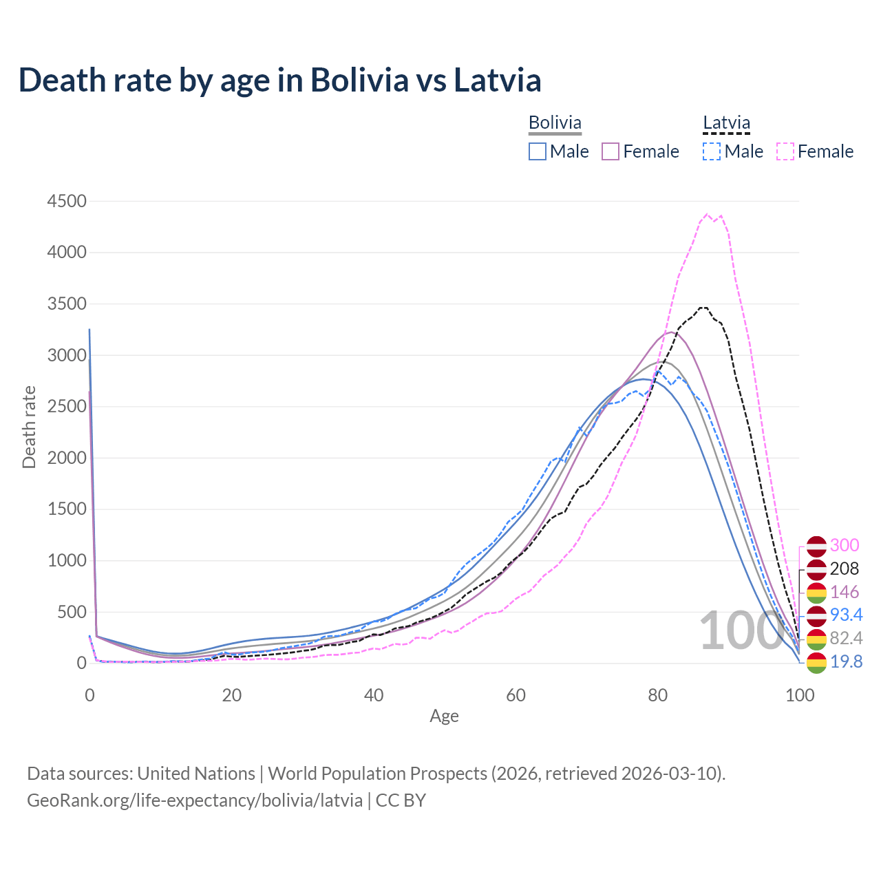 In Bolivia, the most common age of death is 0, compared to 87 in Latvia. The median age of death is 74.5 in Bolivia and 80.4 in Latvia, meaning only half of each cohort is expected to live past that age.