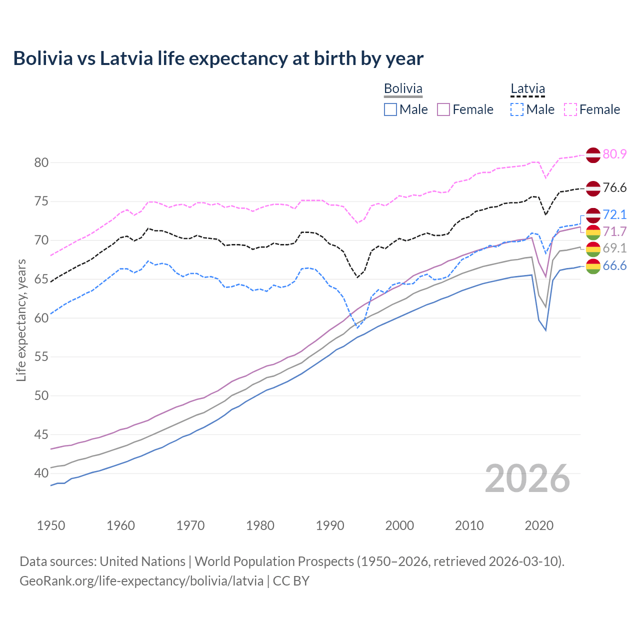 The average life expectancy at birth is 69.1 years in Bolivia vs 76.6 in Latvia. Bolivia is ranked 145/197 by life expectancy, and Latvia is 78/197. In Bolivia, the life expectancy is 66.6 years for males and 71.7 years for females. In Latvia, it's 72.1 years for males and 80.9 years for females.