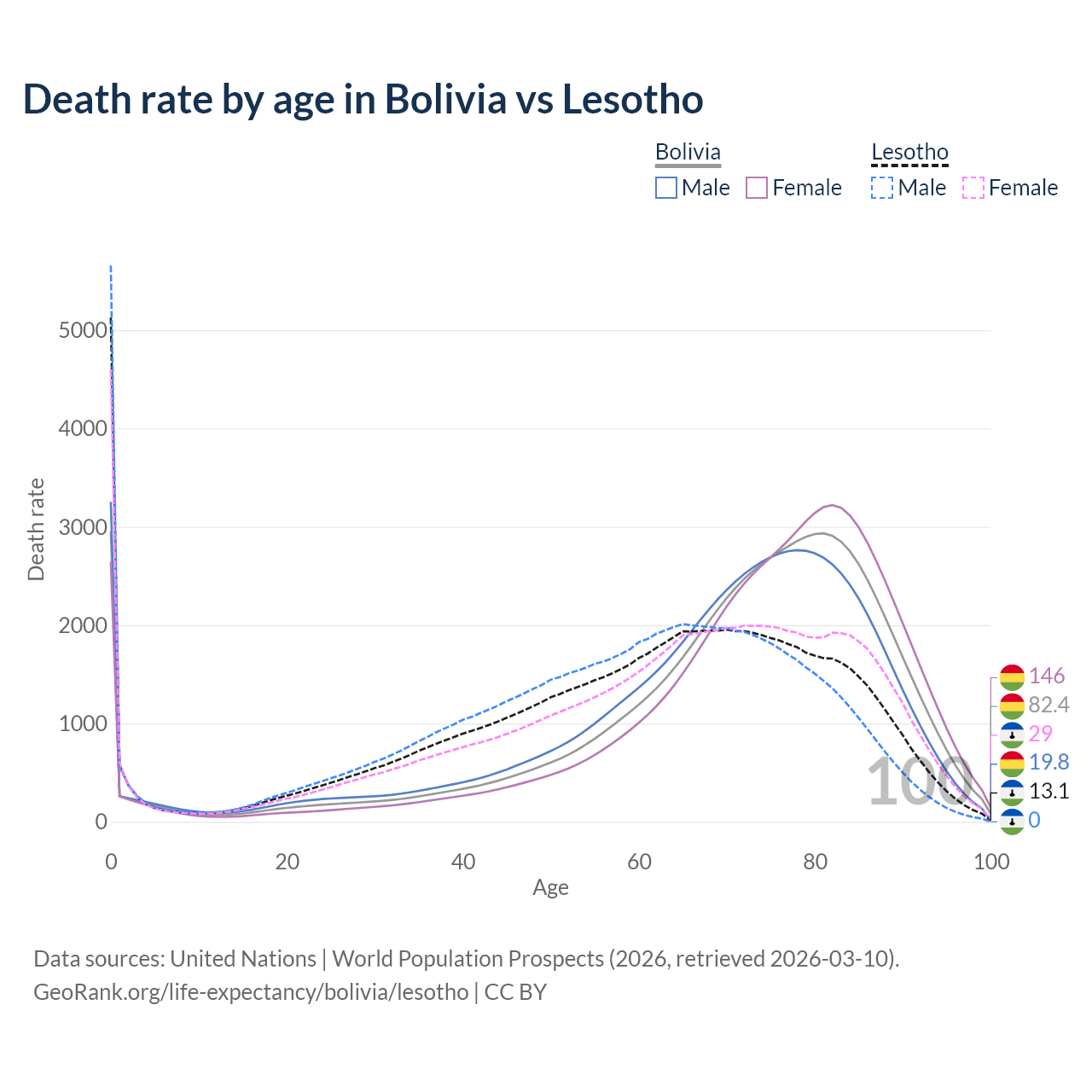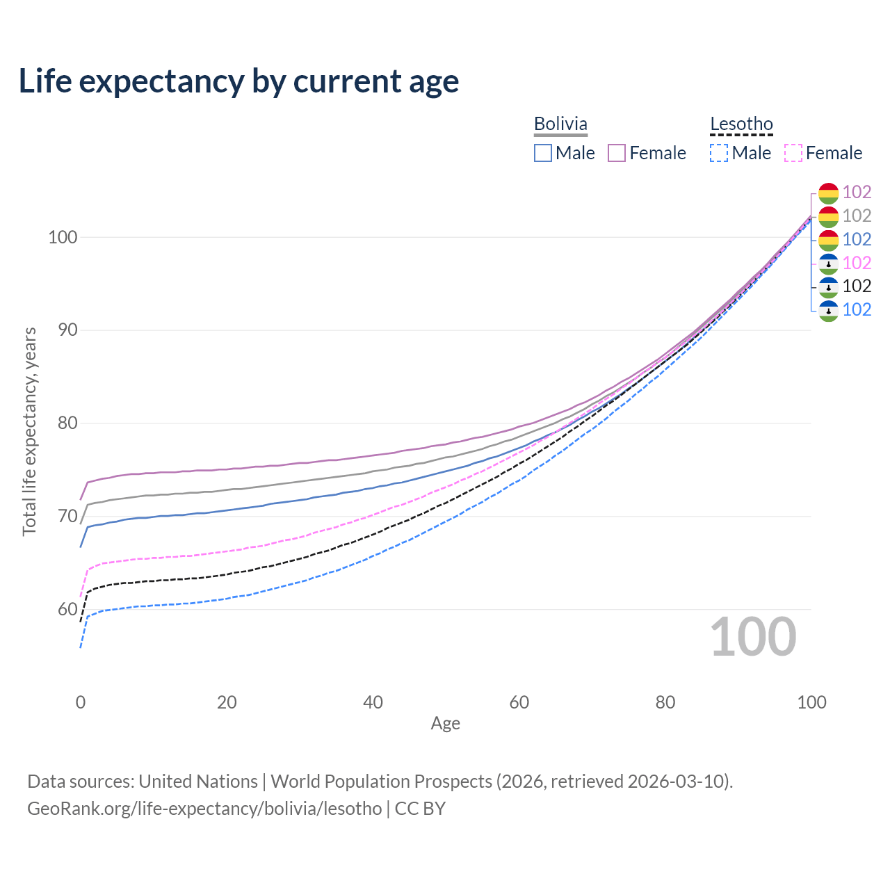 This life expectancy calculator shows the odds of living to 100, 95, 90, and below based on current age for both males and females in Bolivia and Lesotho, along with mean and median age of death. The calculations are based on the 2026 life tables (actuarial tables) from the UN World Population Prospects.