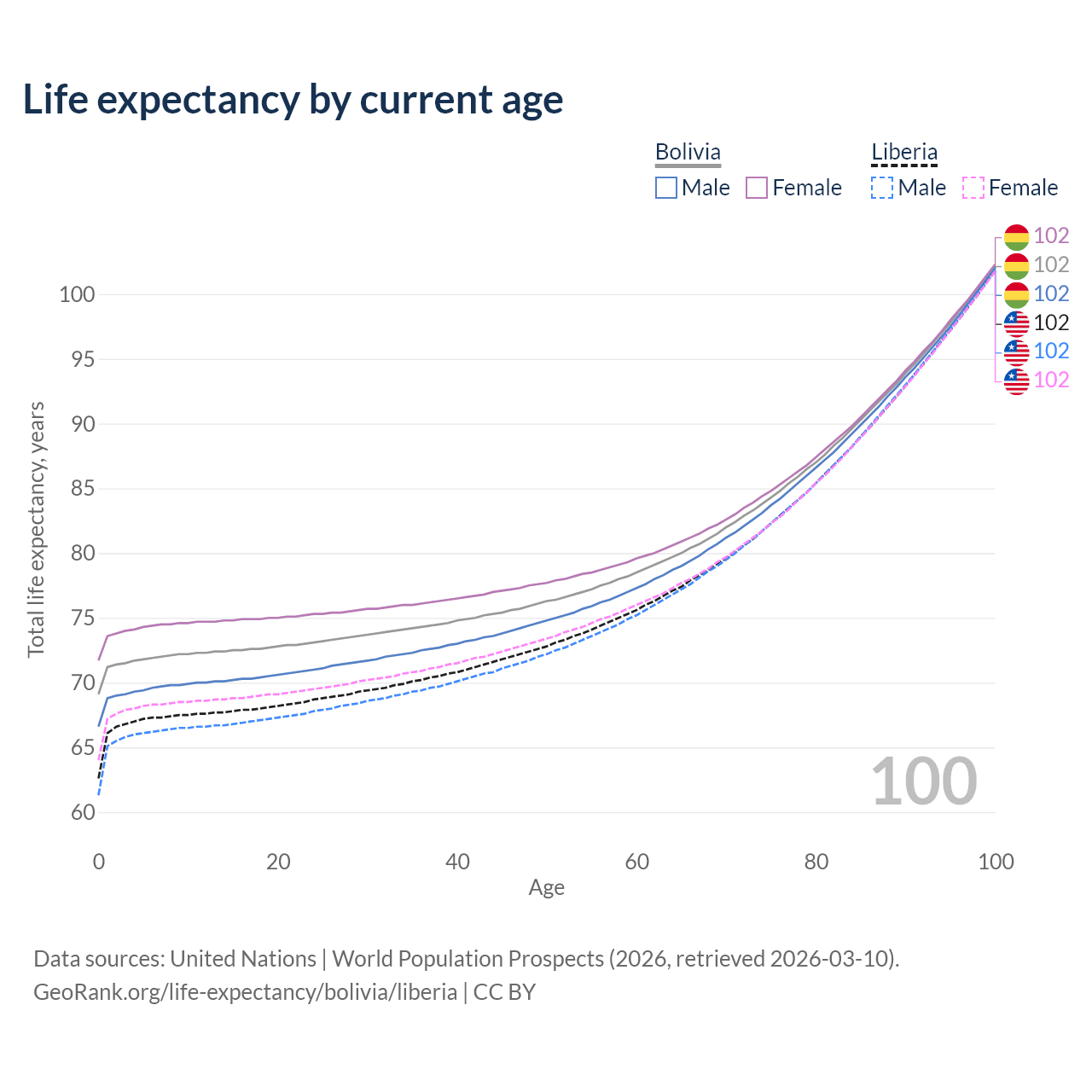 This life expectancy calculator shows the odds of living to 100, 95, 90, and below based on current age for both males and females in Bolivia and Liberia, along with mean and median age of death. The calculations are based on the 2026 life tables (actuarial tables) from the UN World Population Prospects.