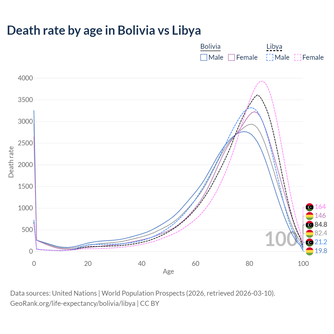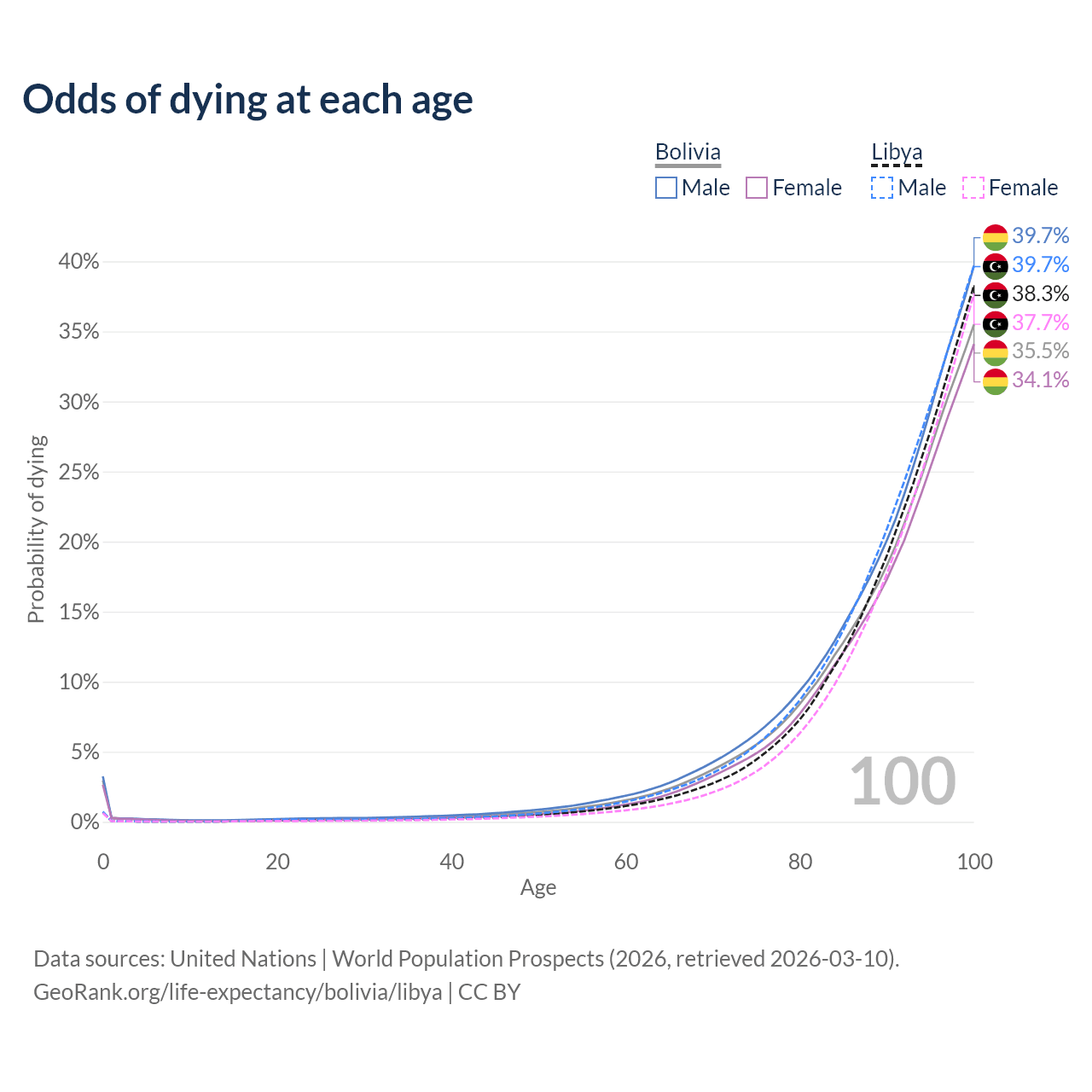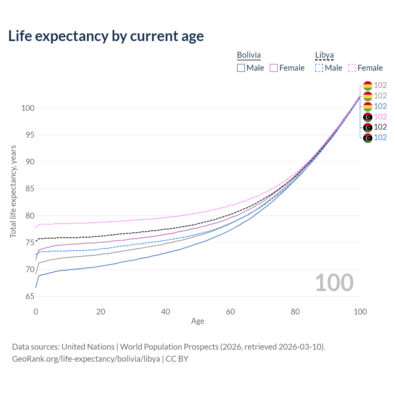 This life expectancy calculator shows the odds of living to 100, 95, 90, and below based on current age for both males and females in Bolivia and Libya, along with mean and median age of death. The calculations are based on the 2026 life tables (actuarial tables) from the UN World Population Prospects.
