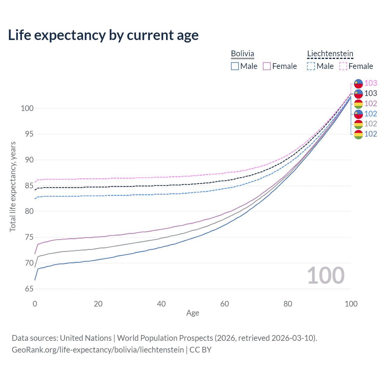 This life expectancy calculator shows the odds of living to 100, 95, 90, and below based on current age for both males and females in Bolivia and Liechtenstein, along with mean and median age of death. The calculations are based on the 2026 life tables (actuarial tables) from the UN World Population Prospects.