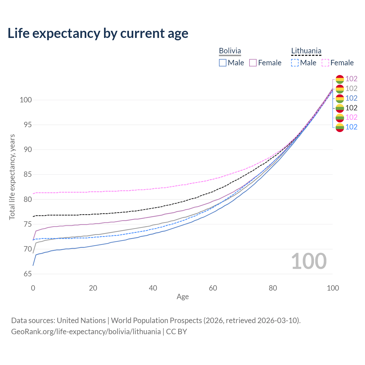 This life expectancy calculator shows the odds of living to 100, 95, 90, and below based on current age for both males and females in Bolivia and Lithuania, along with mean and median age of death. The calculations are based on the 2026 life tables (actuarial tables) from the UN World Population Prospects.
