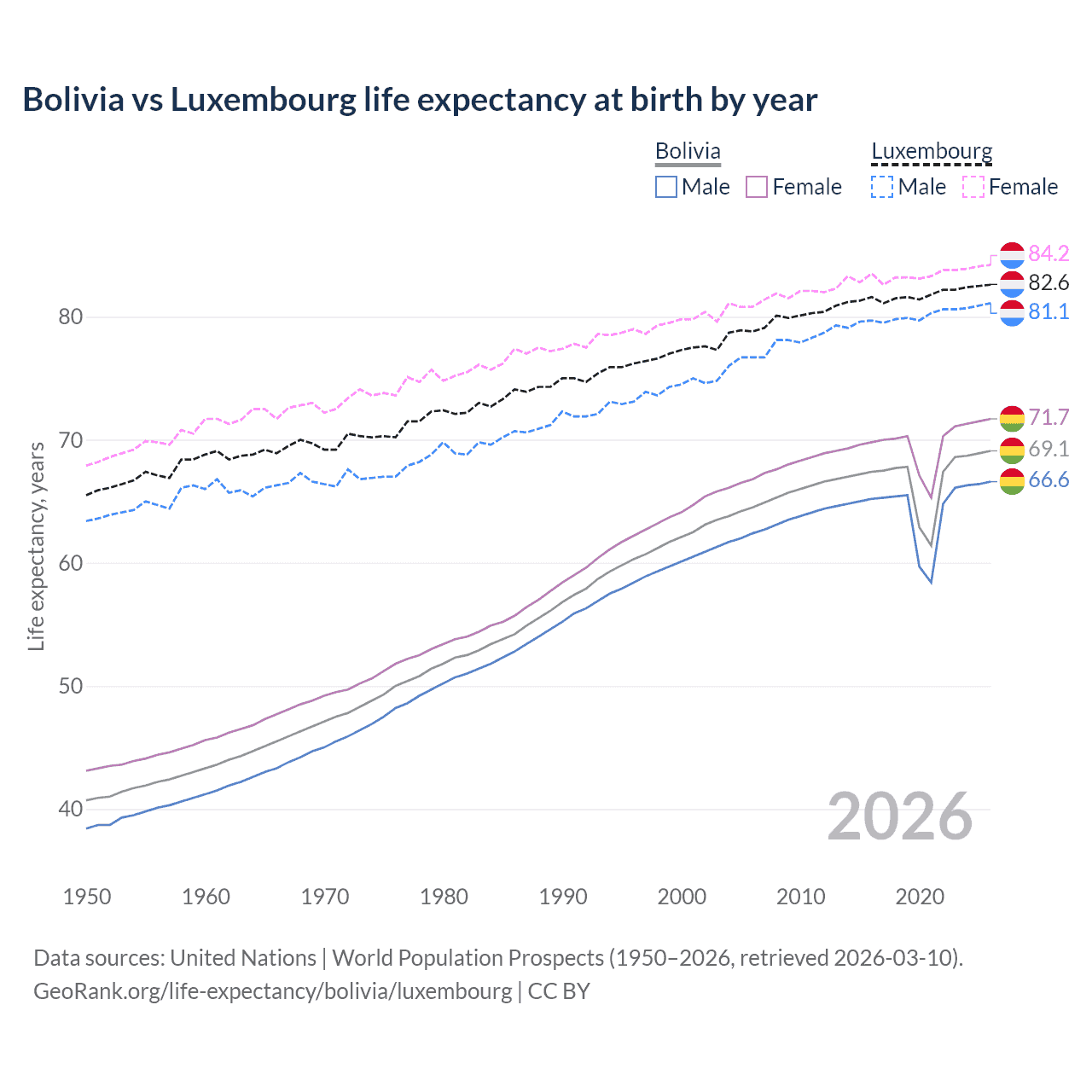The average life expectancy at birth is 69.1 years in Bolivia vs 82.6 in Luxembourg. Bolivia is ranked 145/197 by life expectancy, and Luxembourg is 24/197. In Bolivia, the life expectancy is 66.6 years for males and 71.7 years for females. In Luxembourg, it's 81.1 years for males and 84.2 years for females.