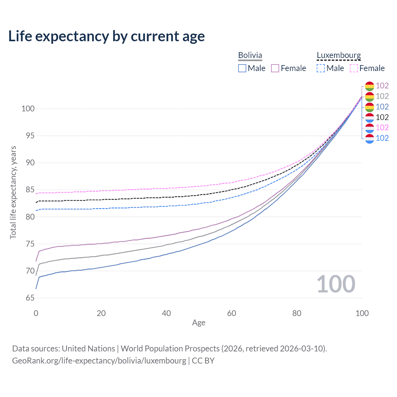 This life expectancy calculator shows the odds of living to 100, 95, 90, and below based on current age for both males and females in Bolivia and Luxembourg, along with mean and median age of death. The calculations are based on the 2026 life tables (actuarial tables) from the UN World Population Prospects.