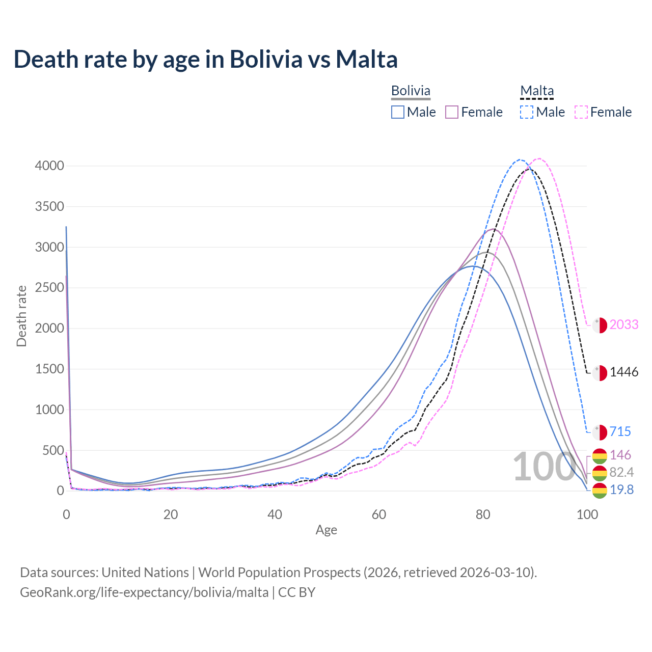 In Bolivia, the most common age of death is 0, compared to 89 in Malta. The median age of death is 74.5 in Bolivia and 86.3 in Malta, meaning only half of each cohort is expected to live past that age.