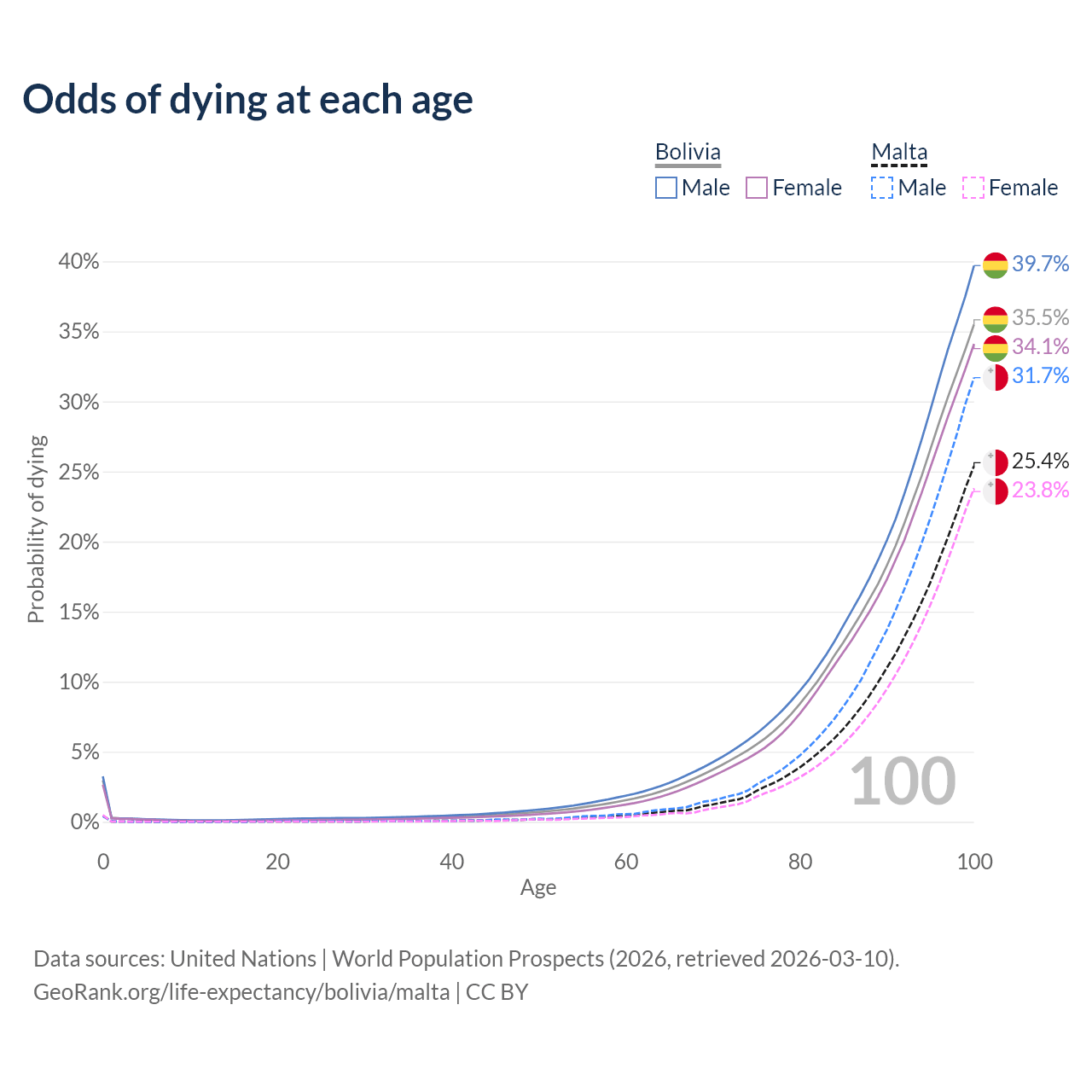 This life expectancy calculator shows the odds of living to 100, 95, 90, and below based on current age for both males and females in Bolivia and Malta, along with mean and median age of death. The calculations are based on the 2026 life tables (actuarial tables) from the UN World Population Prospects.