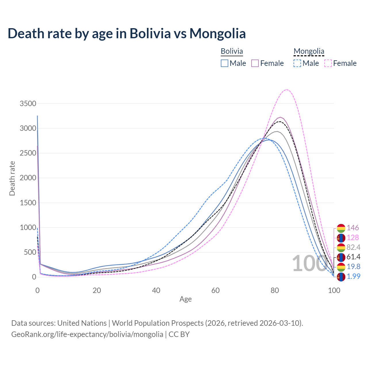 In Bolivia, the most common age of death is 0, compared to 82 in Mongolia. The median age of death is 74.5 in Bolivia and 76 in Mongolia, meaning only half of each cohort is expected to live past that age.