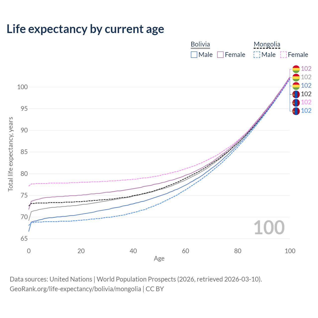 This life expectancy calculator shows the odds of living to 100, 95, 90, and below based on current age for both males and females in Bolivia and Mongolia, along with mean and median age of death. The calculations are based on the 2026 life tables (actuarial tables) from the UN World Population Prospects.
