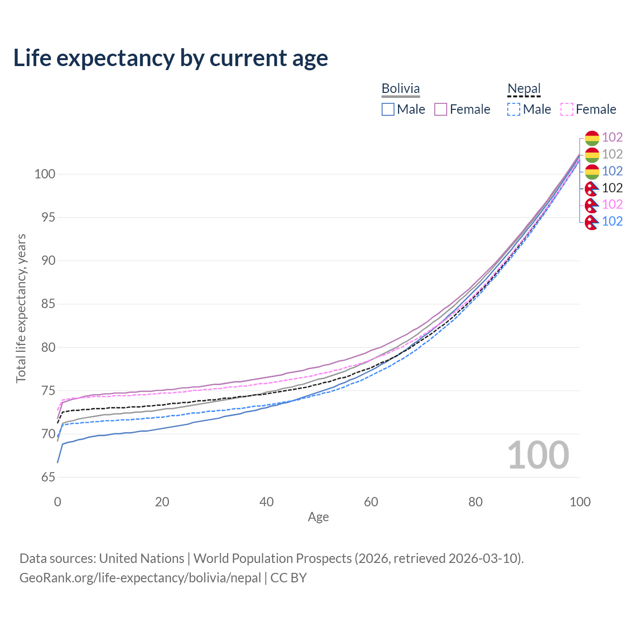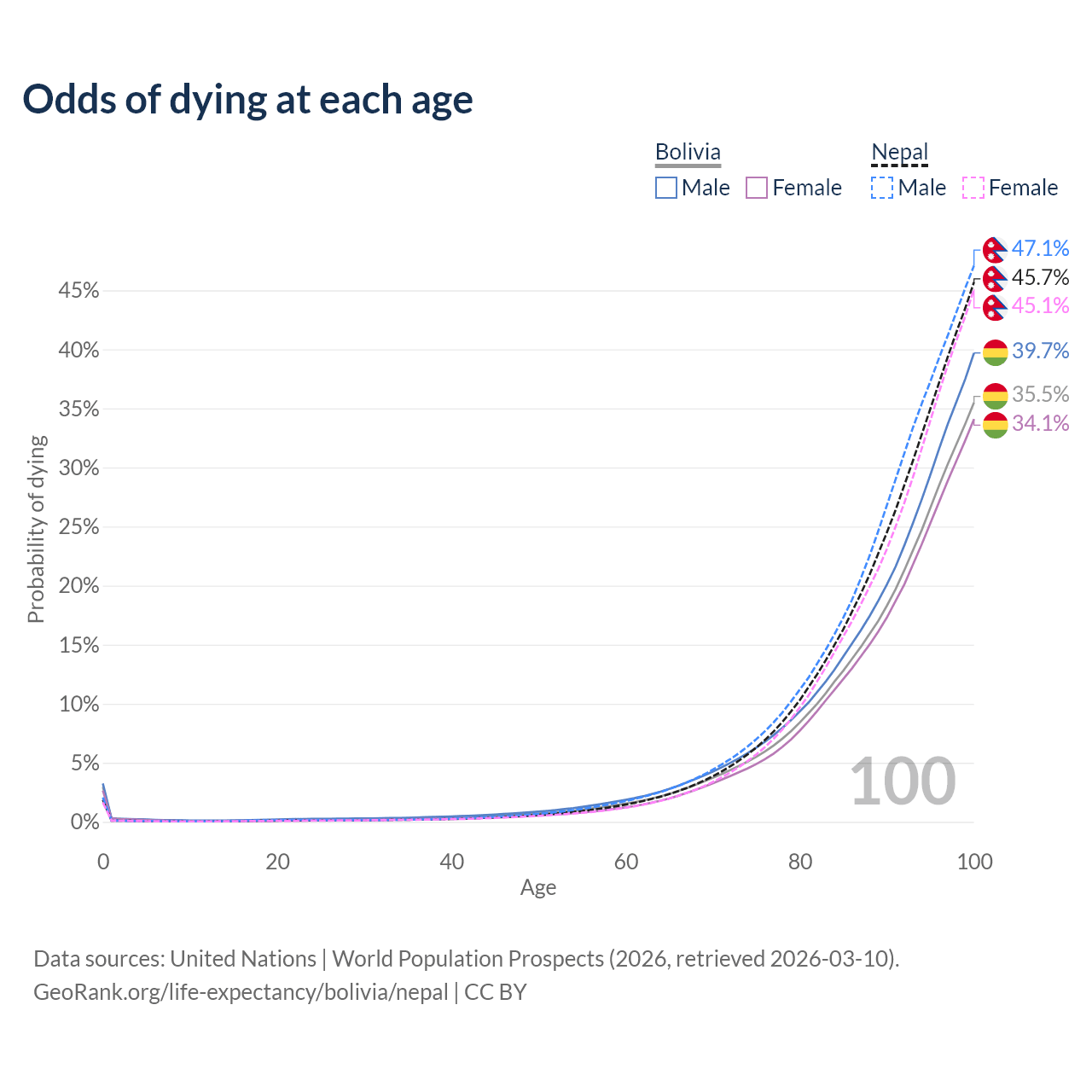 This life expectancy calculator shows the odds of living to 100, 95, 90, and below based on current age for both males and females in Bolivia and Nepal, along with mean and median age of death. The calculations are based on the 2026 life tables (actuarial tables) from the UN World Population Prospects.