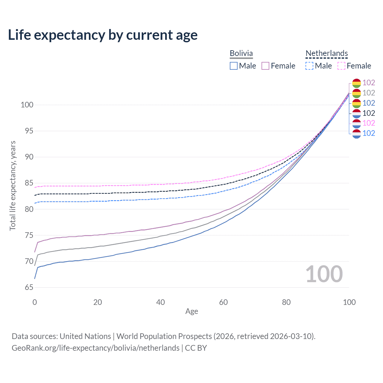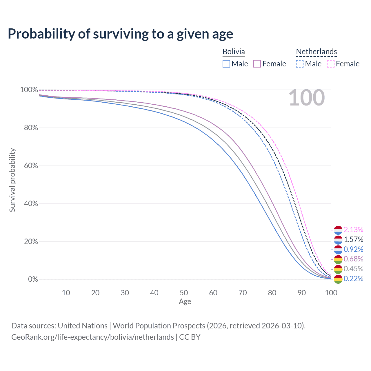 This life expectancy calculator shows the odds of living to 100, 95, 90, and below based on current age for both males and females in Bolivia and the Netherlands, along with mean and median age of death. The calculations are based on the 2026 life tables (actuarial tables) from the UN World Population Prospects.