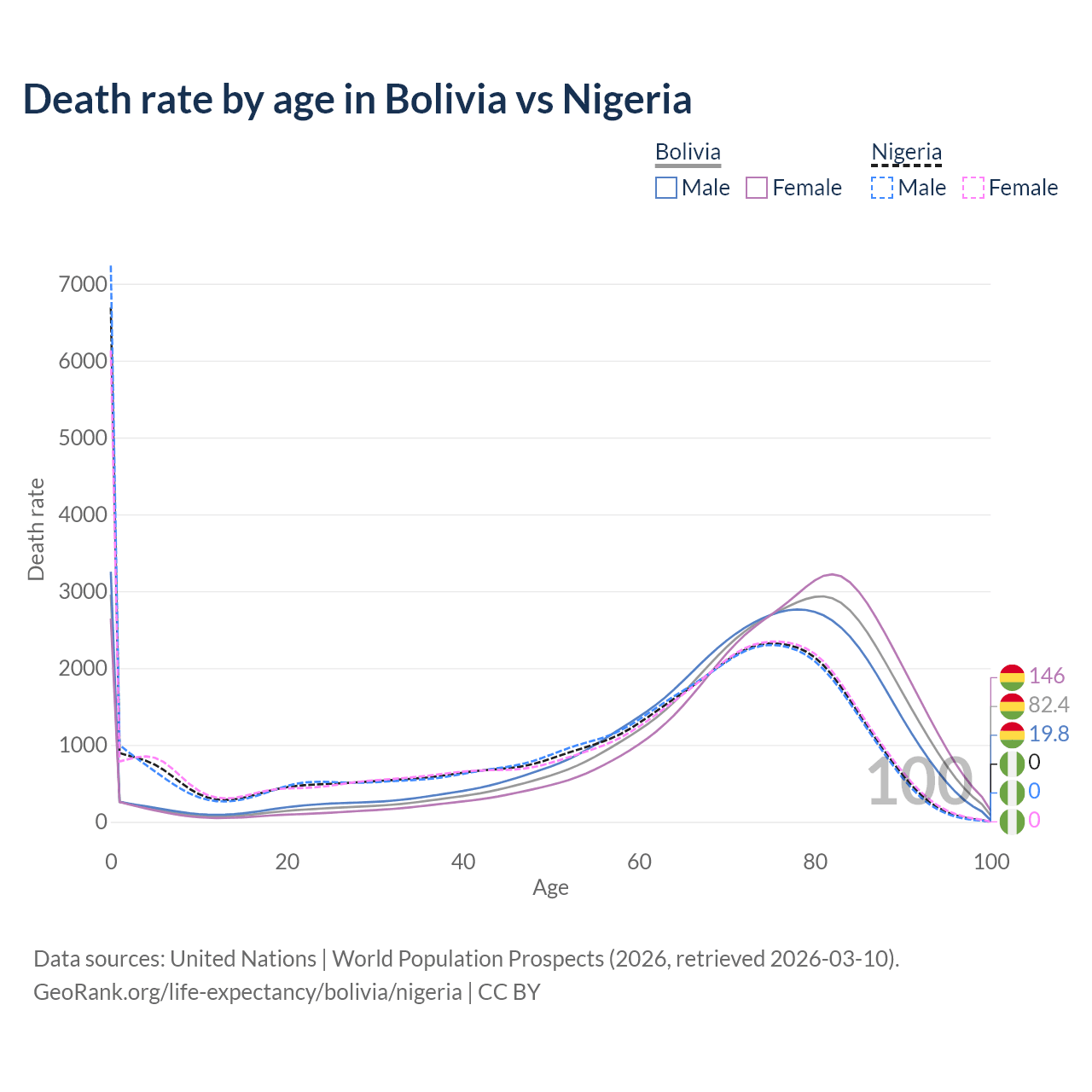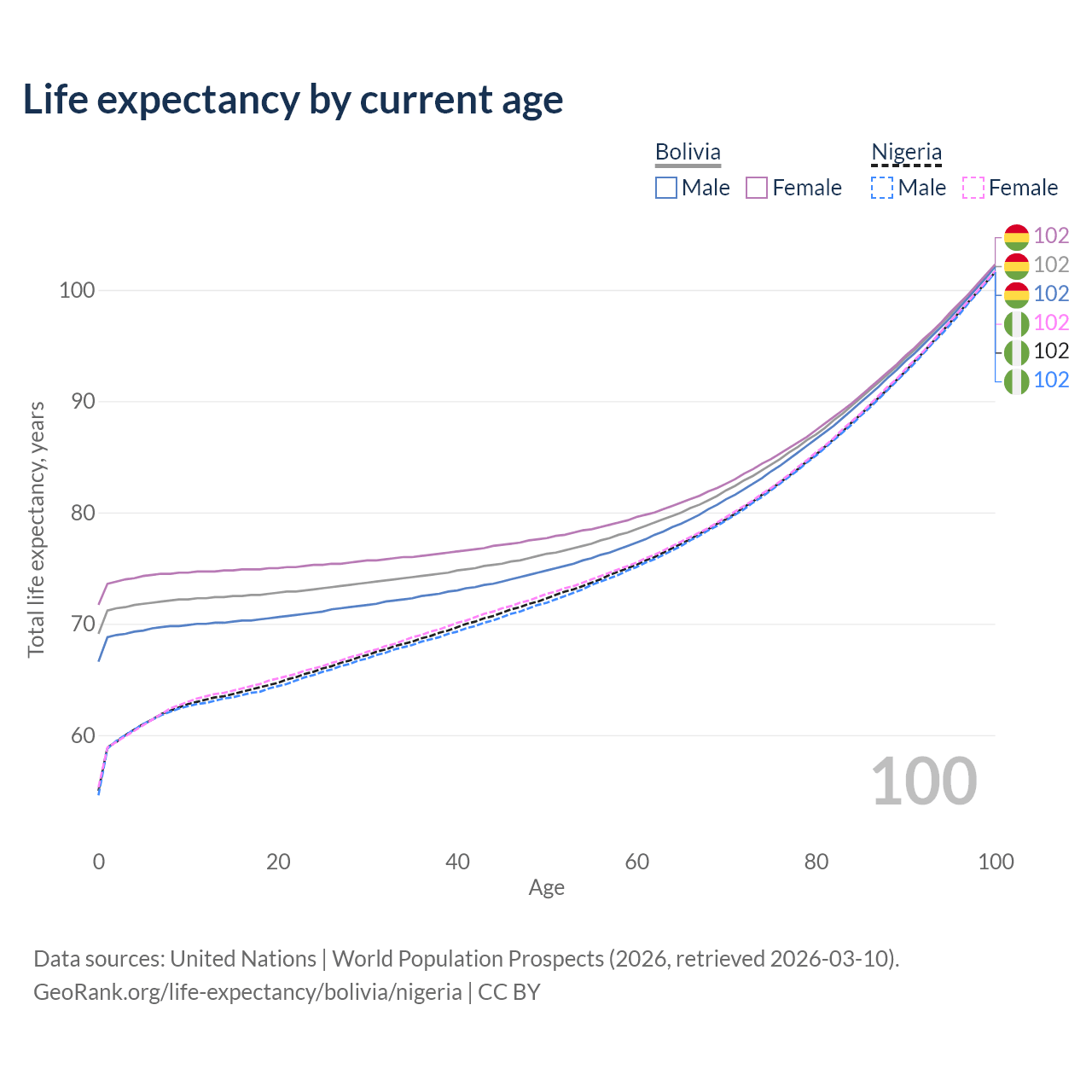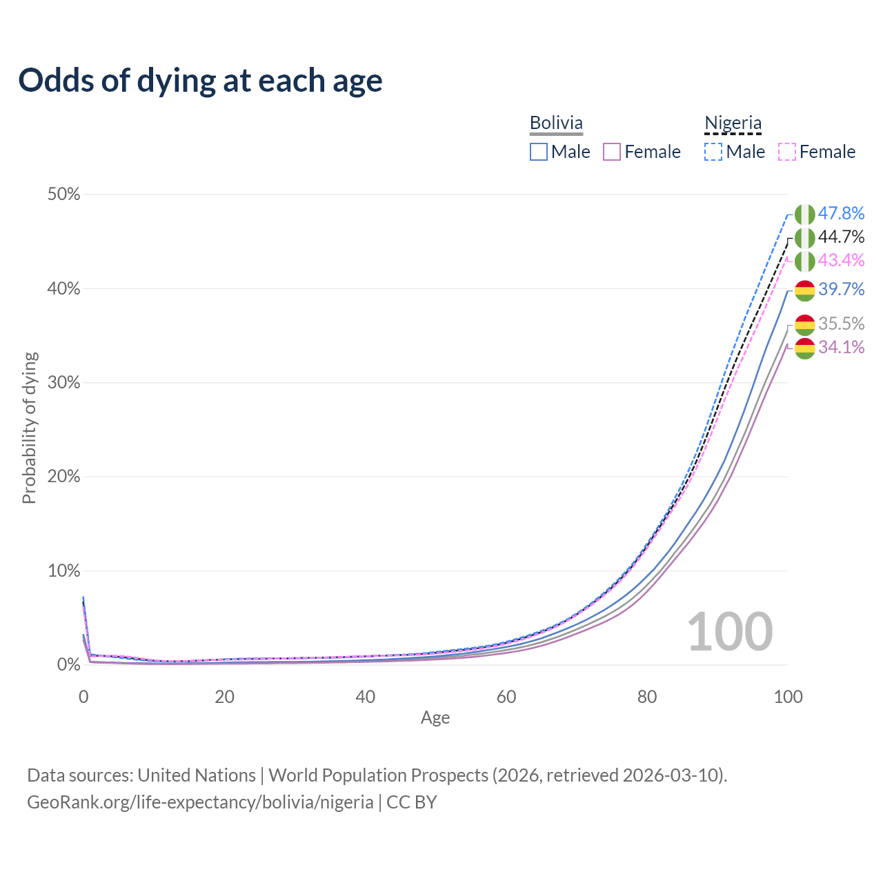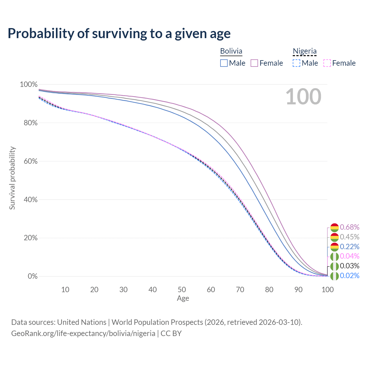This life expectancy calculator shows the odds of living to 100, 95, 90, and below based on current age for both males and females in Bolivia and Nigeria, along with mean and median age of death. The calculations are based on the 2026 life tables (actuarial tables) from the UN World Population Prospects.