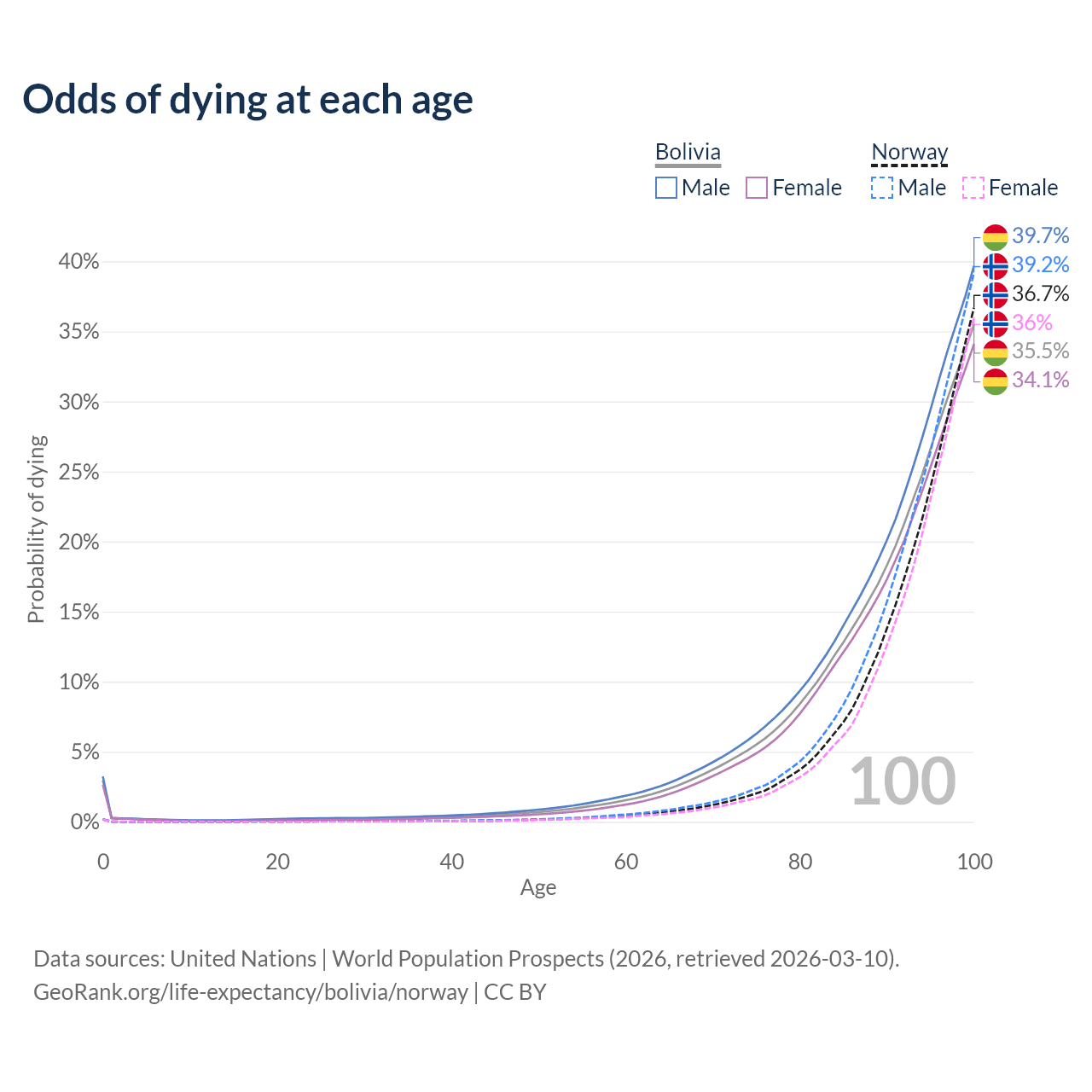 This life expectancy calculator shows the odds of living to 100, 95, 90, and below based on current age for both males and females in Bolivia and Norway, along with mean and median age of death. The calculations are based on the 2026 life tables (actuarial tables) from the UN World Population Prospects.