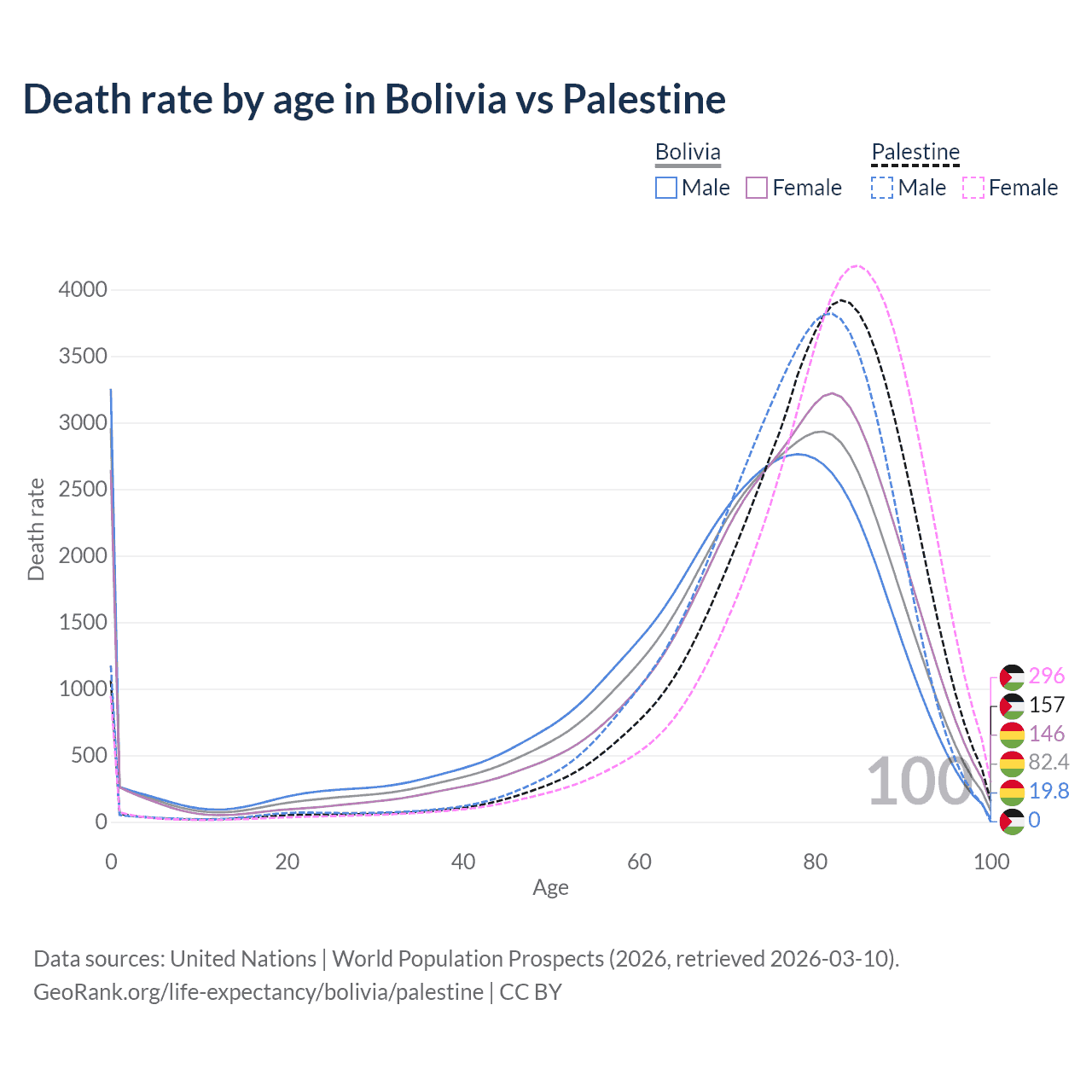 In Bolivia, the most common age of death is 0, compared to 83 in Palestine. The median age of death is 74.5 in Bolivia and 80.5 in Palestine, meaning only half of each cohort is expected to live past that age.