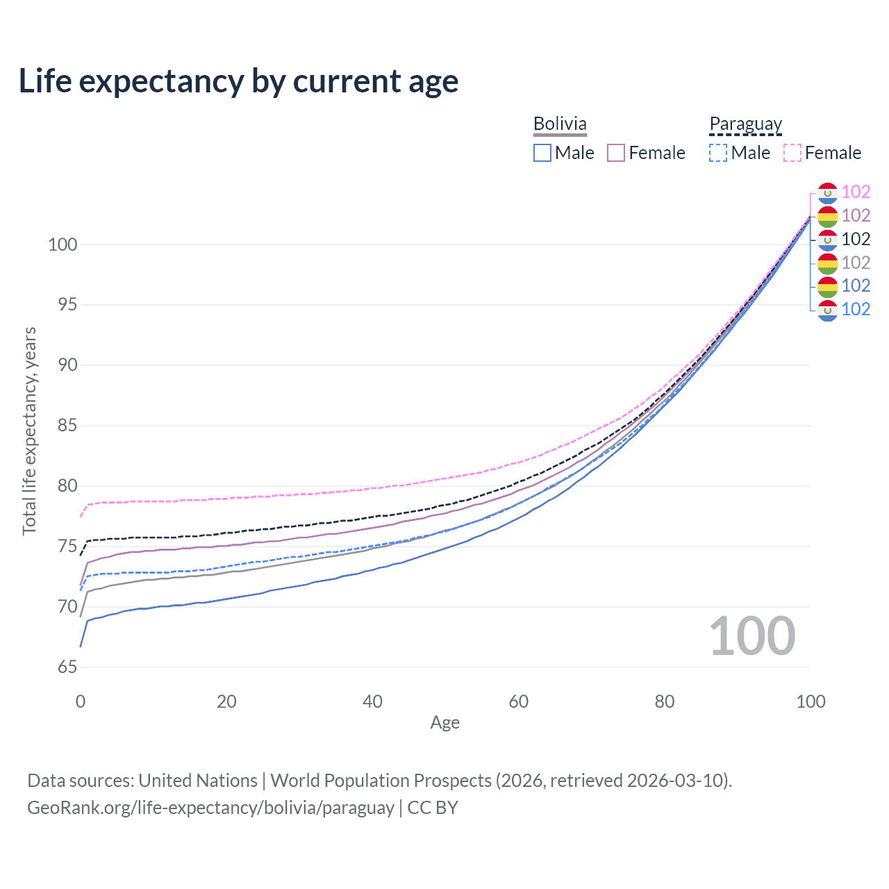This life expectancy calculator shows the odds of living to 100, 95, 90, and below based on current age for both males and females in Bolivia and Paraguay, along with mean and median age of death. The calculations are based on the 2026 life tables (actuarial tables) from the UN World Population Prospects.