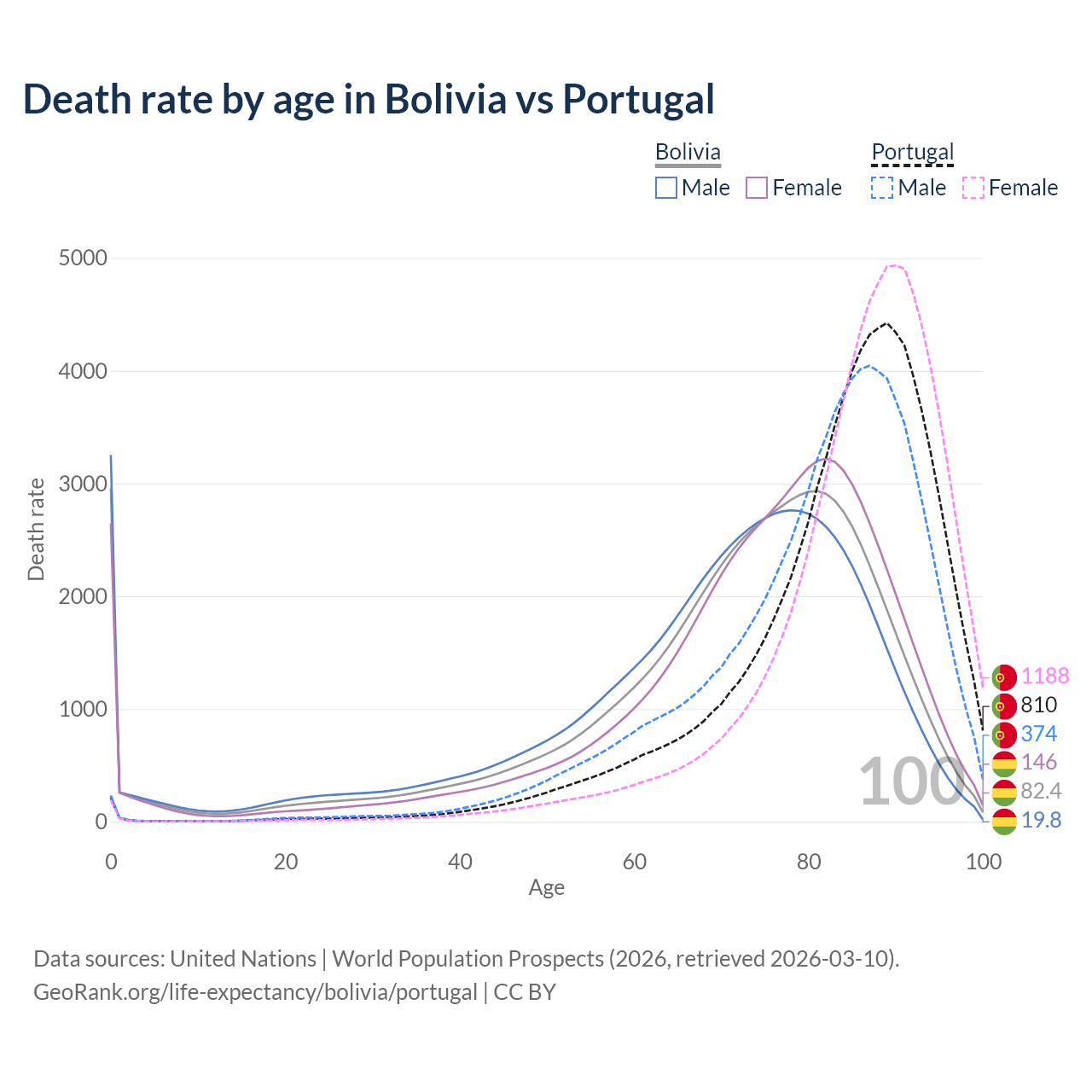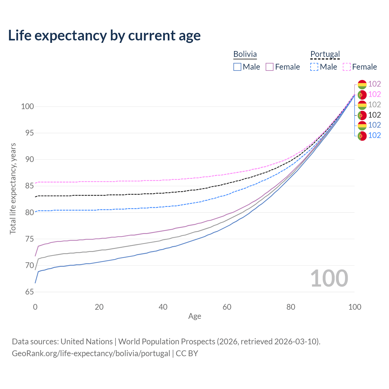 This life expectancy calculator shows the odds of living to 100, 95, 90, and below based on current age for both males and females in Bolivia and Portugal, along with mean and median age of death. The calculations are based on the 2026 life tables (actuarial tables) from the UN World Population Prospects.