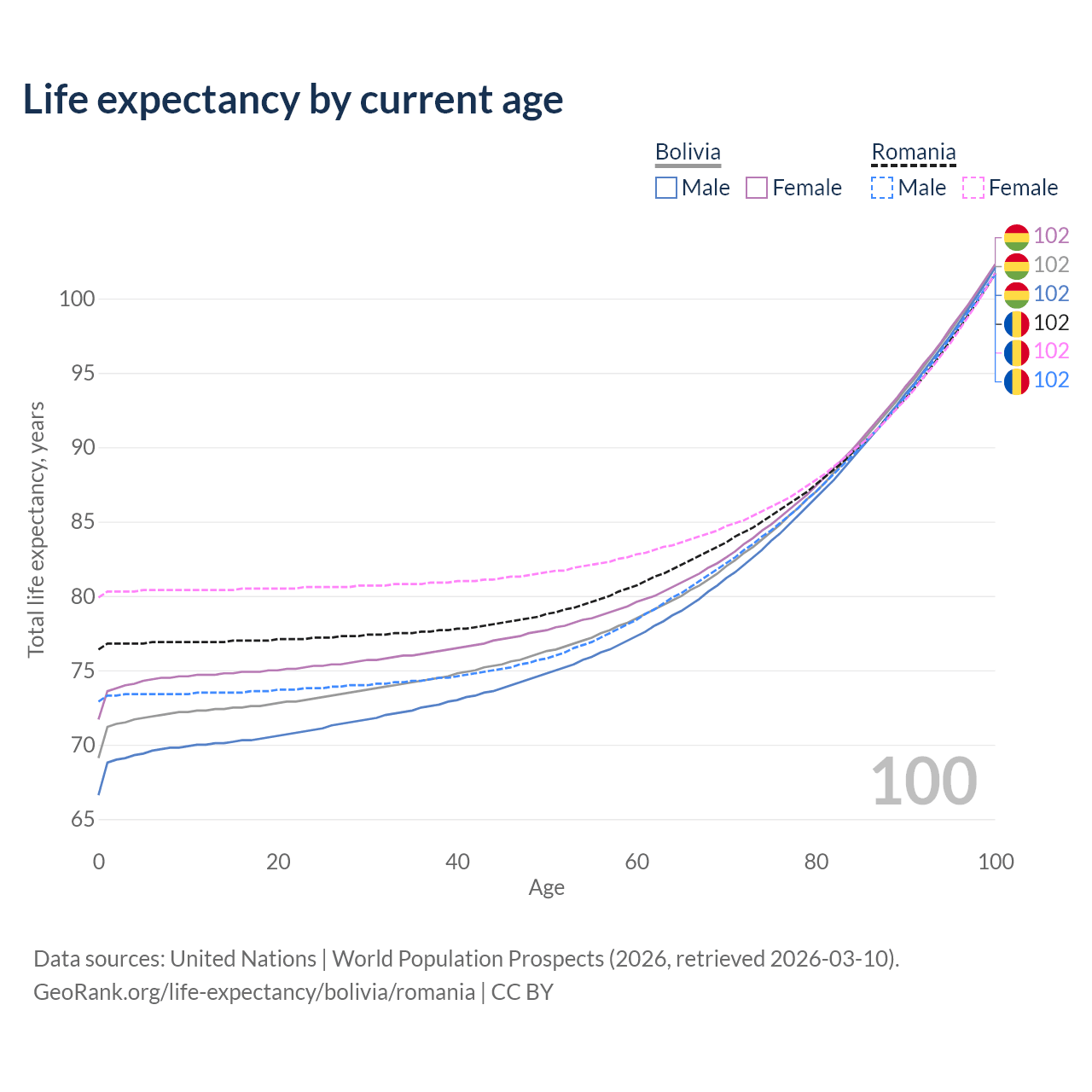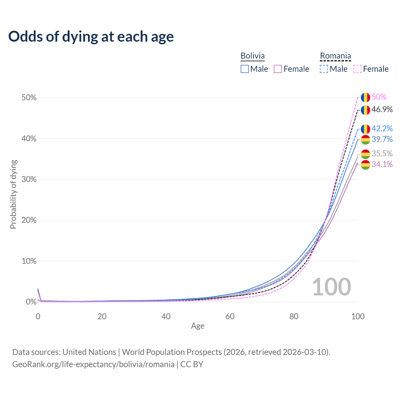 This life expectancy calculator shows the odds of living to 100, 95, 90, and below based on current age for both males and females in Bolivia and Romania, along with mean and median age of death. The calculations are based on the 2026 life tables (actuarial tables) from the UN World Population Prospects.