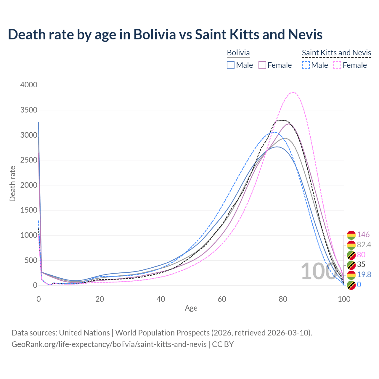 In Bolivia, the most common age of death is 0, compared to 80 in Saint Kitts and Nevis. The median age of death is 74.5 in Bolivia and 76.3 in Saint Kitts and Nevis, meaning only half of each cohort is expected to live past that age.