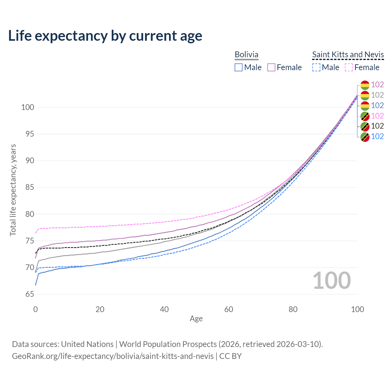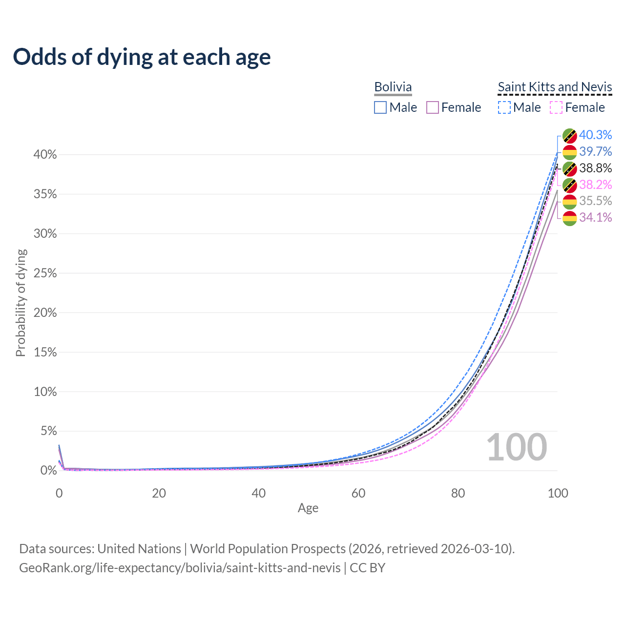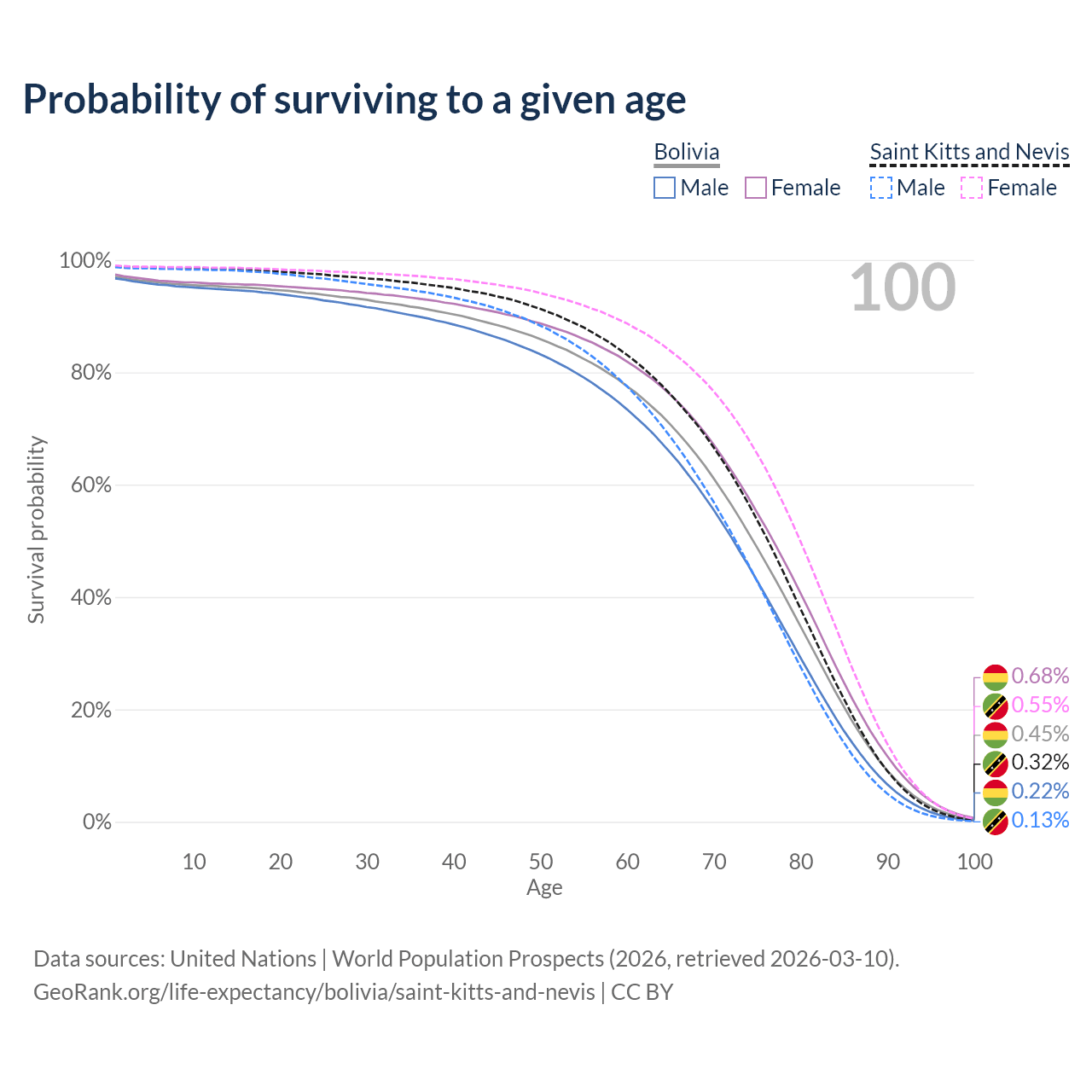 This life expectancy calculator shows the odds of living to 100, 95, 90, and below based on current age for both males and females in Bolivia and Saint Kitts and Nevis, along with mean and median age of death. The calculations are based on the 2026 life tables (actuarial tables) from the UN World Population Prospects.