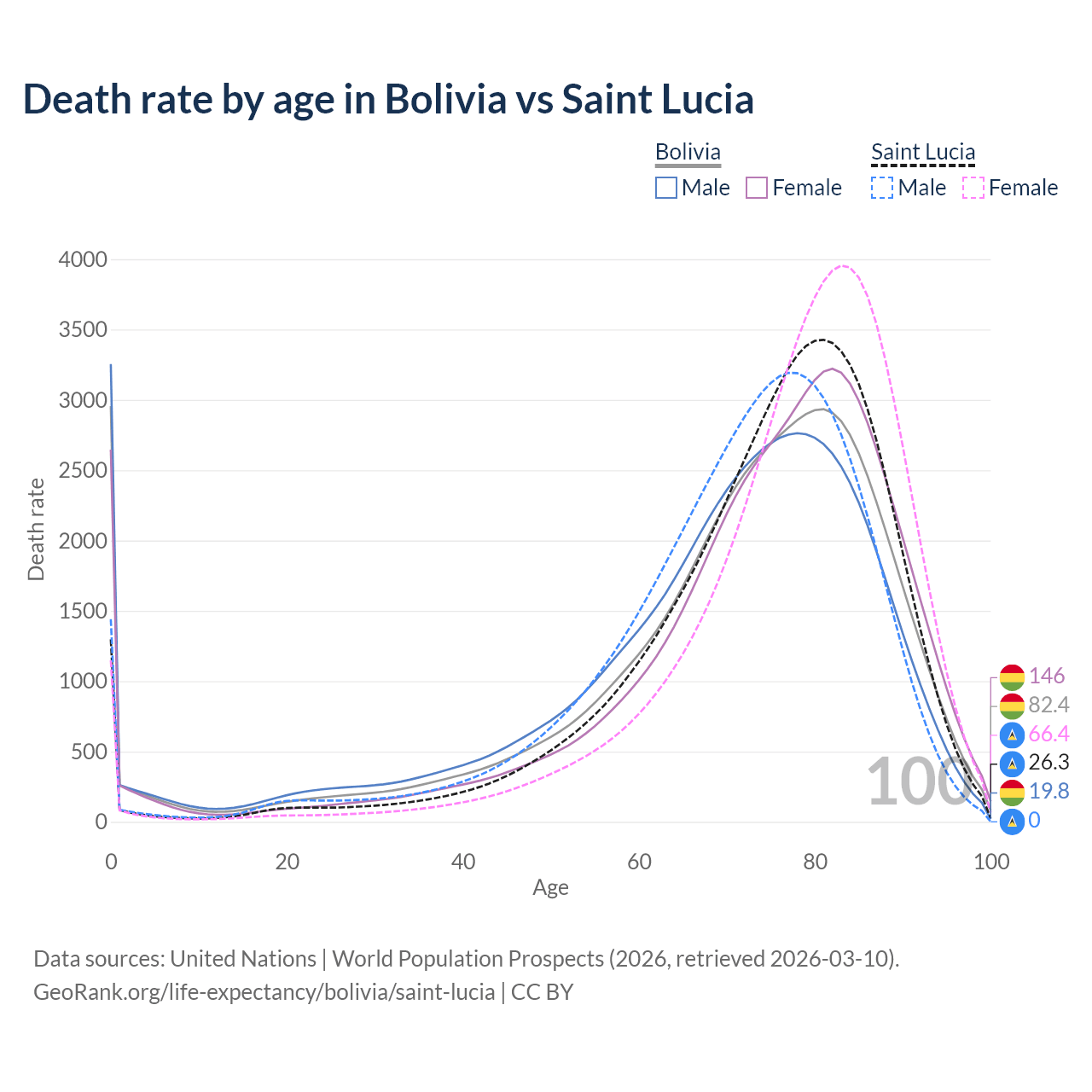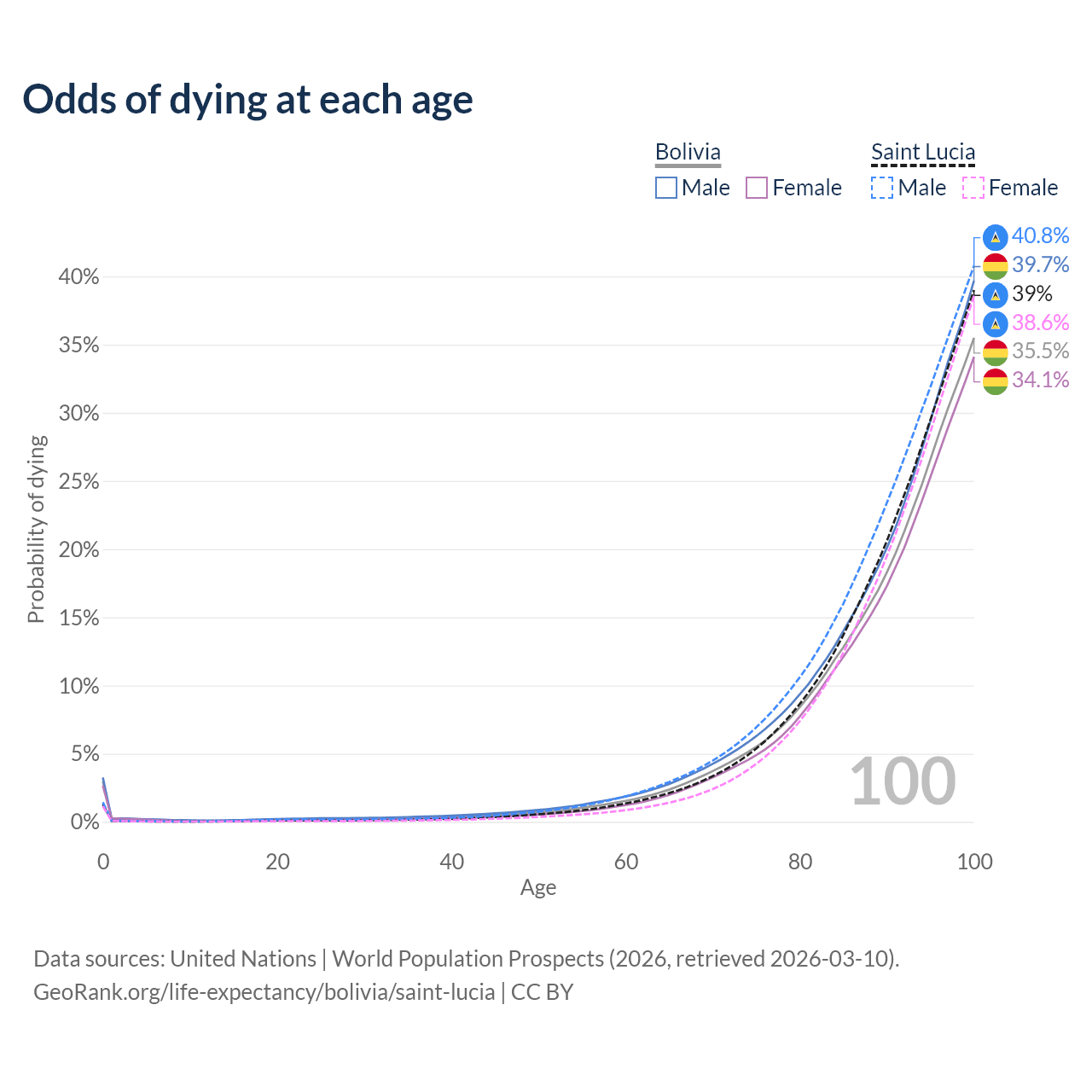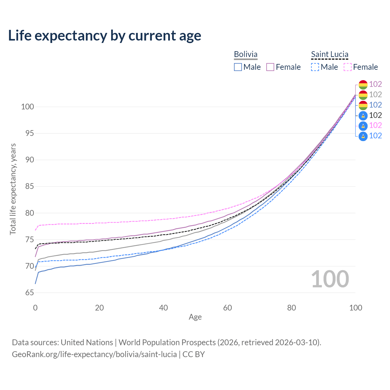 This life expectancy calculator shows the odds of living to 100, 95, 90, and below based on current age for both males and females in Bolivia and Saint Lucia, along with mean and median age of death. The calculations are based on the 2026 life tables (actuarial tables) from the UN World Population Prospects.