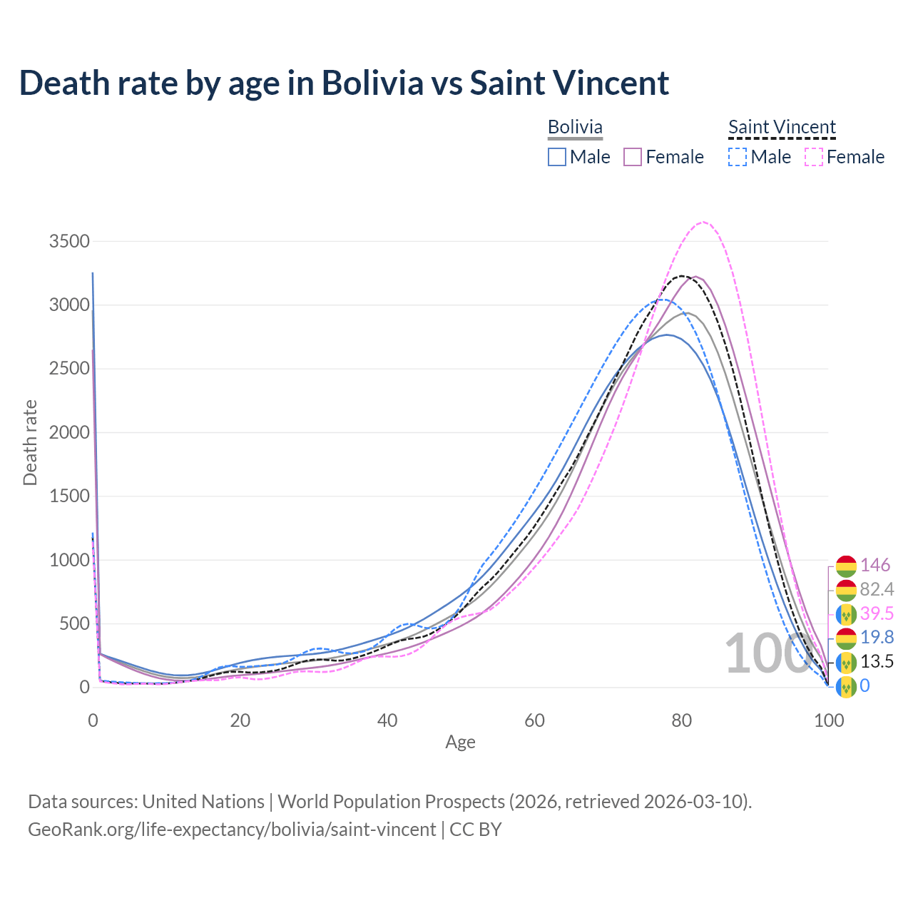 In Bolivia, the most common age of death is 0, compared to 80 in Saint Vincent. The median age of death is 74.5 in Bolivia and 75.6 in Saint Vincent, meaning only half of each cohort is expected to live past that age.