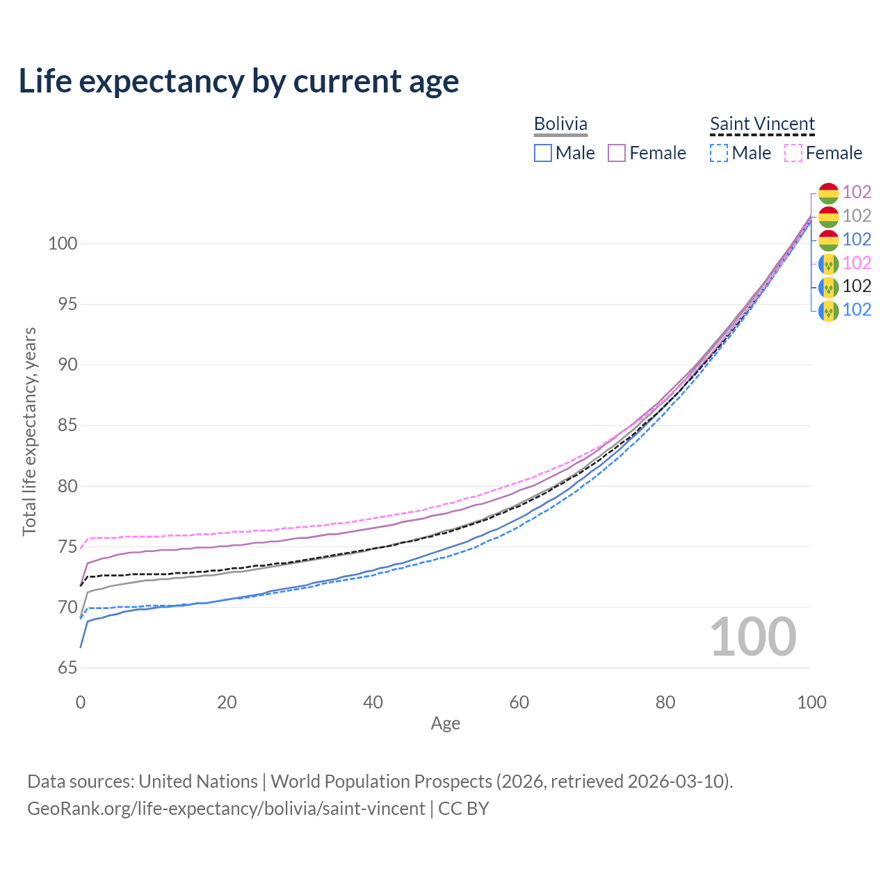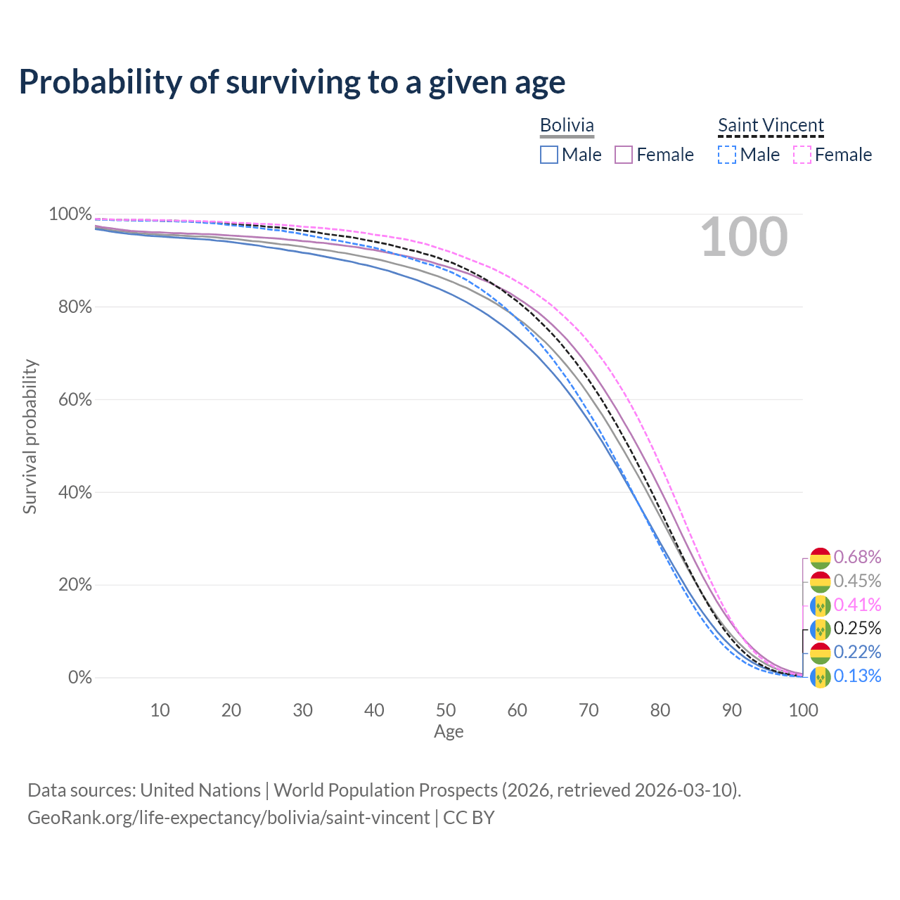 This life expectancy calculator shows the odds of living to 100, 95, 90, and below based on current age for both males and females in Bolivia and Saint Vincent, along with mean and median age of death. The calculations are based on the 2026 life tables (actuarial tables) from the UN World Population Prospects.