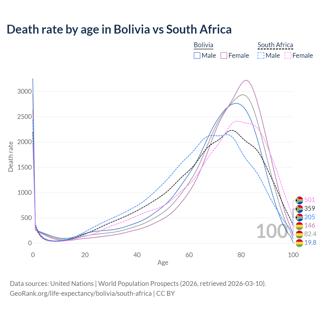In Bolivia, the most common age of death is 0, compared to 77 in South Africa. The median age of death is 74.5 in Bolivia and 70.8 in South Africa, meaning only half of each cohort is expected to live past that age.