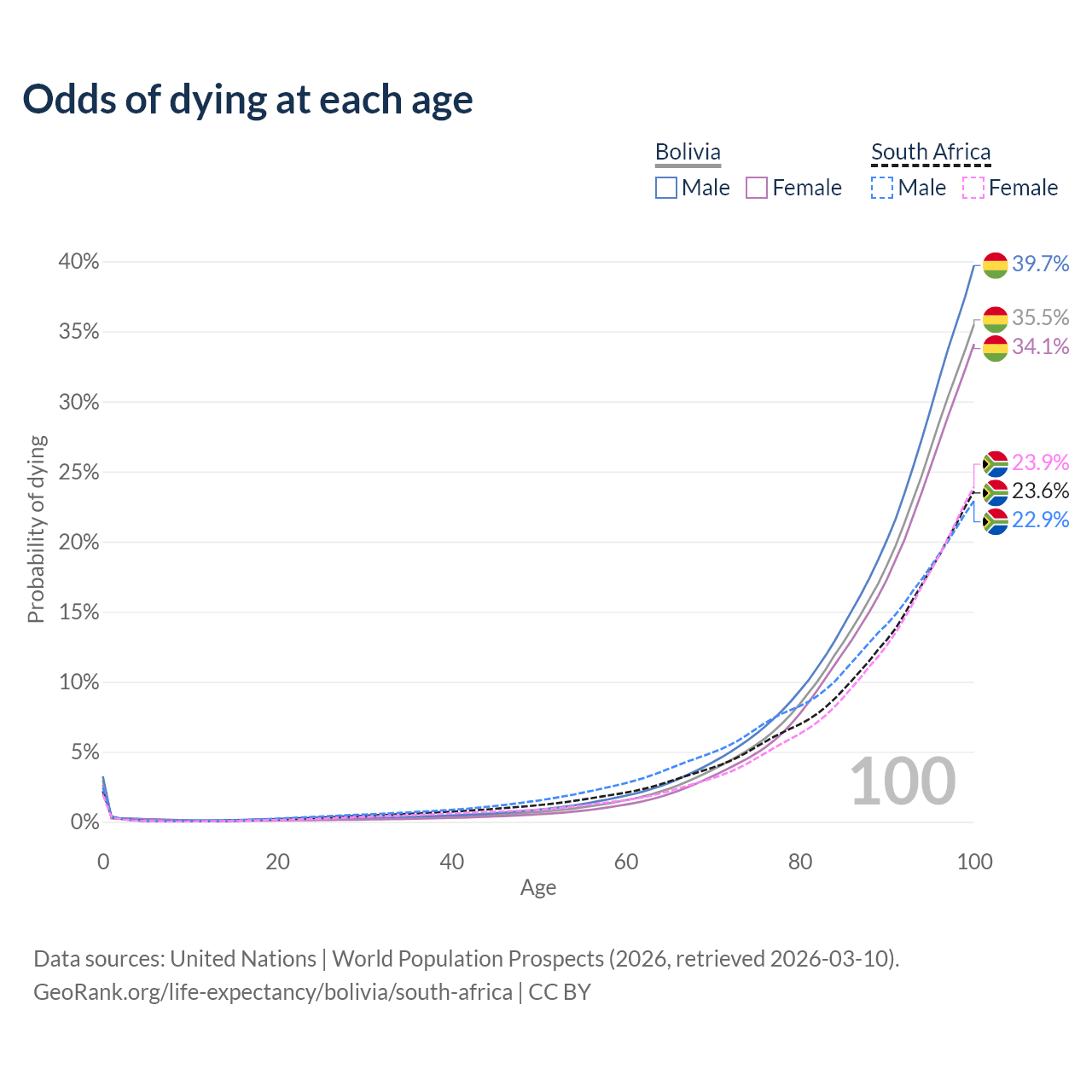 This life expectancy calculator shows the odds of living to 100, 95, 90, and below based on current age for both males and females in Bolivia and South Africa, along with mean and median age of death. The calculations are based on the 2026 life tables (actuarial tables) from the UN World Population Prospects.
