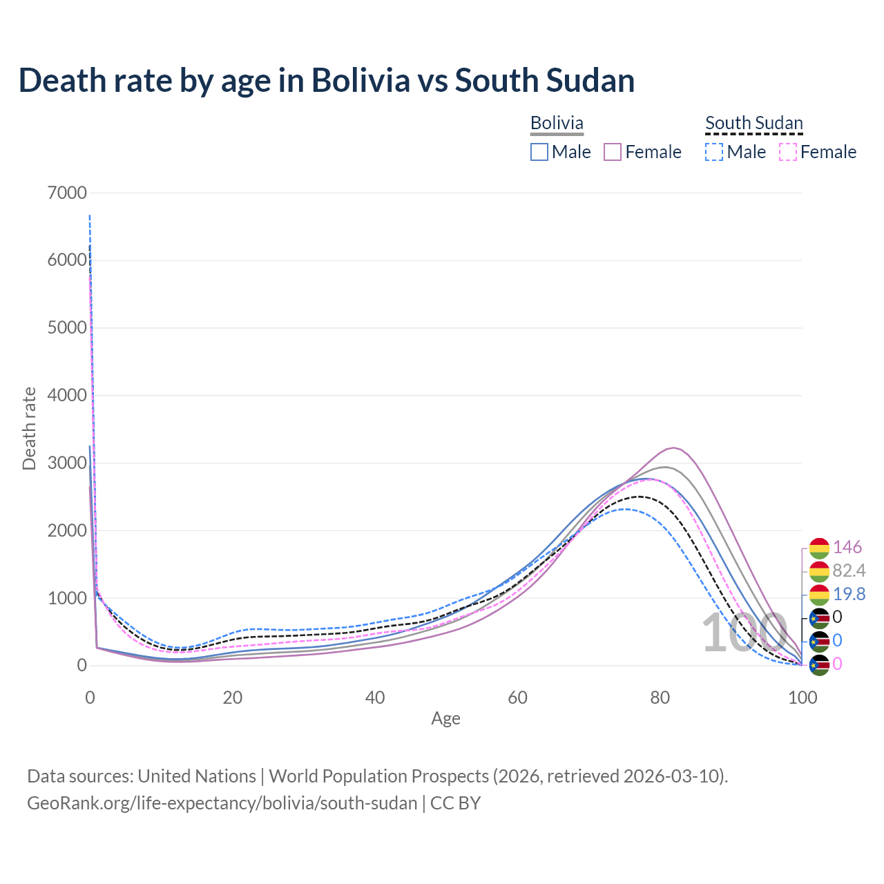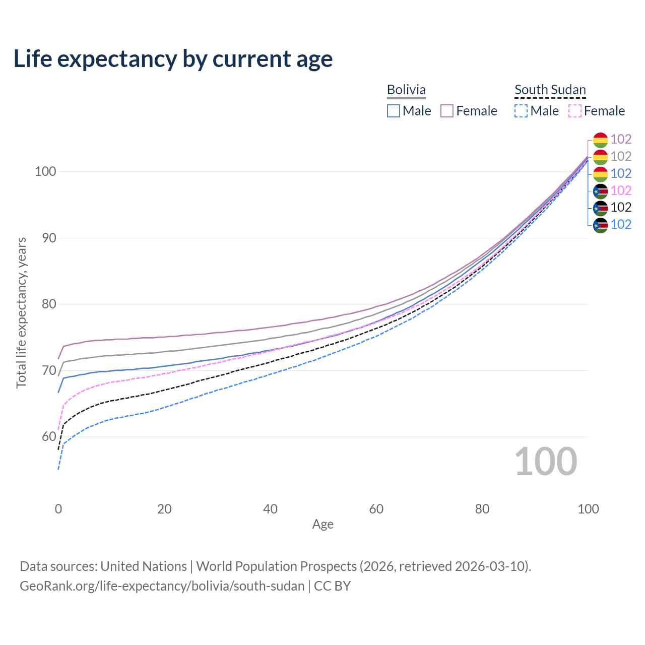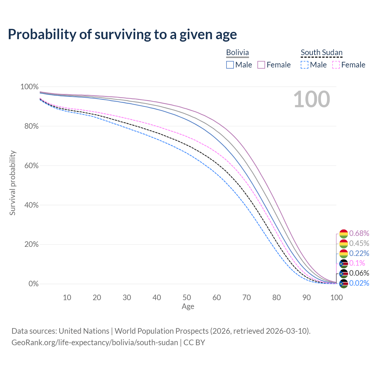 This life expectancy calculator shows the odds of living to 100, 95, 90, and below based on current age for both males and females in Bolivia and South Sudan, along with mean and median age of death. The calculations are based on the 2026 life tables (actuarial tables) from the UN World Population Prospects.